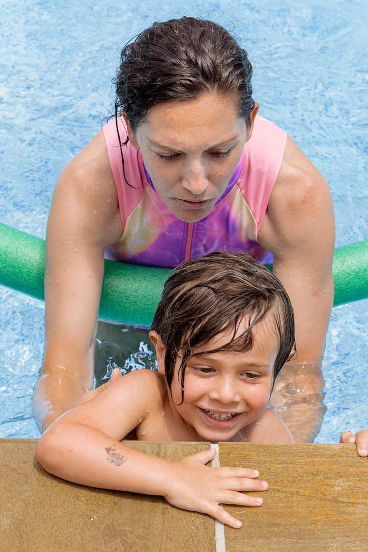 Une combinaison parfaite : les enfants font une séance de natation d'une heure et les grands-parents profitent d'une séance d'entraînement aquatique douce de 45 minutes, axée sur l'équilibre, la mobilité et la force.