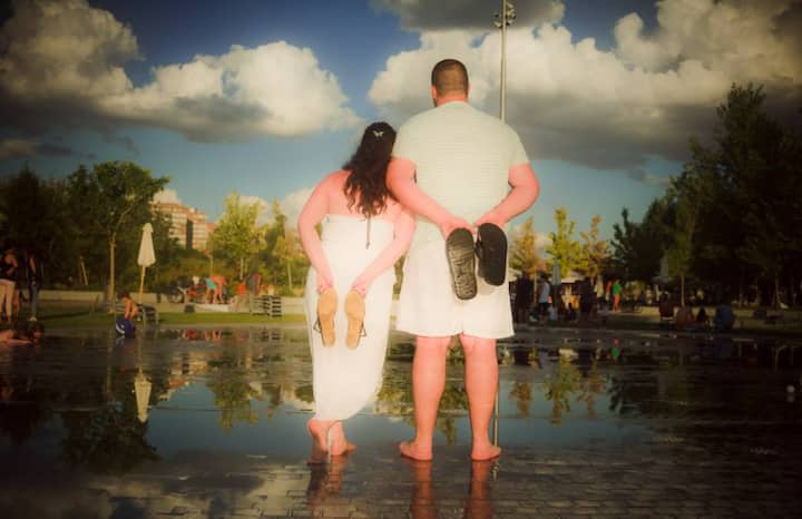 Le couple se promène parmi les fontaines de Madrid Río, jouant avec l'eau et partageant des regards complices. Les rires et les reflets créent des photos spontanées.