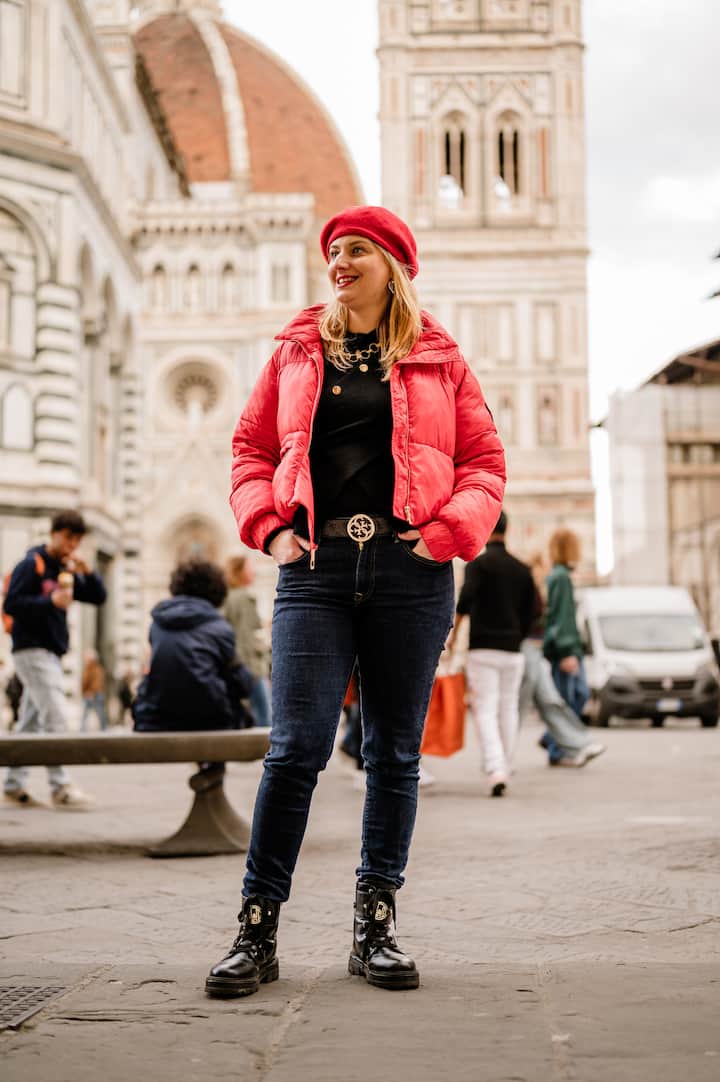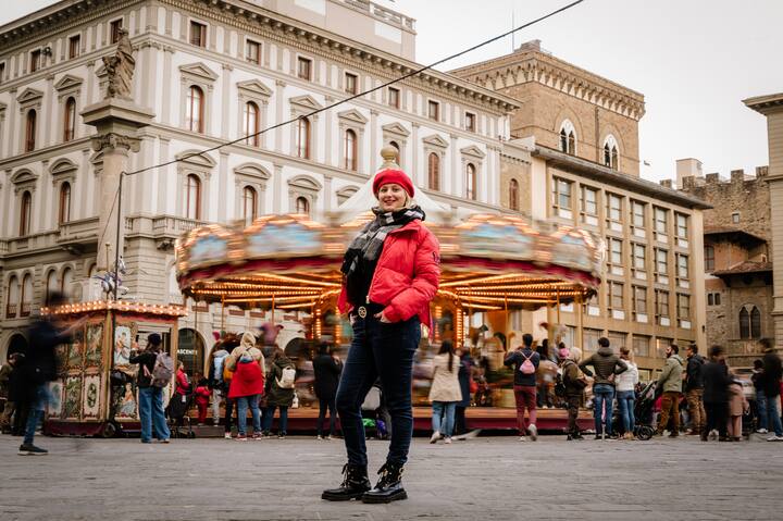 Une séance photo sur la Piazza della Repubblica avec un carrousel en arrière-plan, puis sur la Piazza del Duomo pour capturer l'essence de Florence avec la cathédrale en arrière-plan.