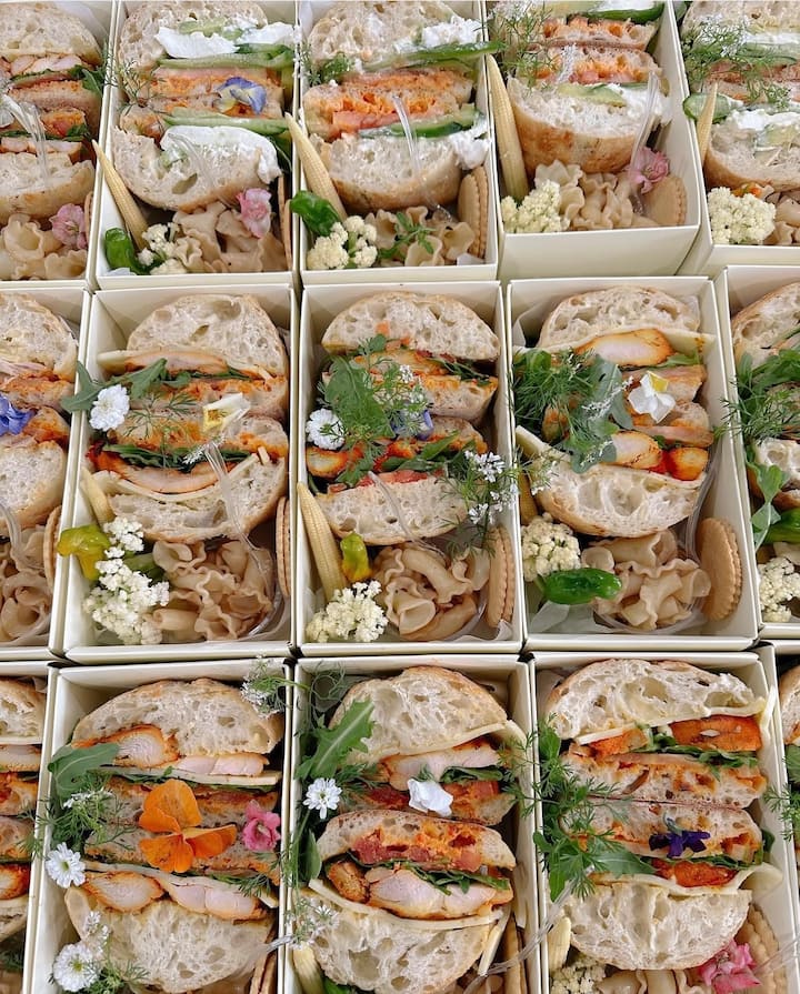 Boîtes à sandwich avec des garnitures + des petites pâtes artisanales + des croustilles de pommes de terre ou des fruits frais. Parfait pour les clients, les employés, les réunions, les événements de marque, ou peut-être les rassemblements sociaux et les pique-niques.