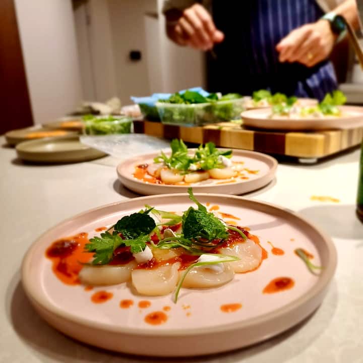 Une expérience gourmande en 5 services avec canapés, entrée, plat, dessert et accompagnement. Un mélange de saveurs du monde et d'ingrédients locaux.