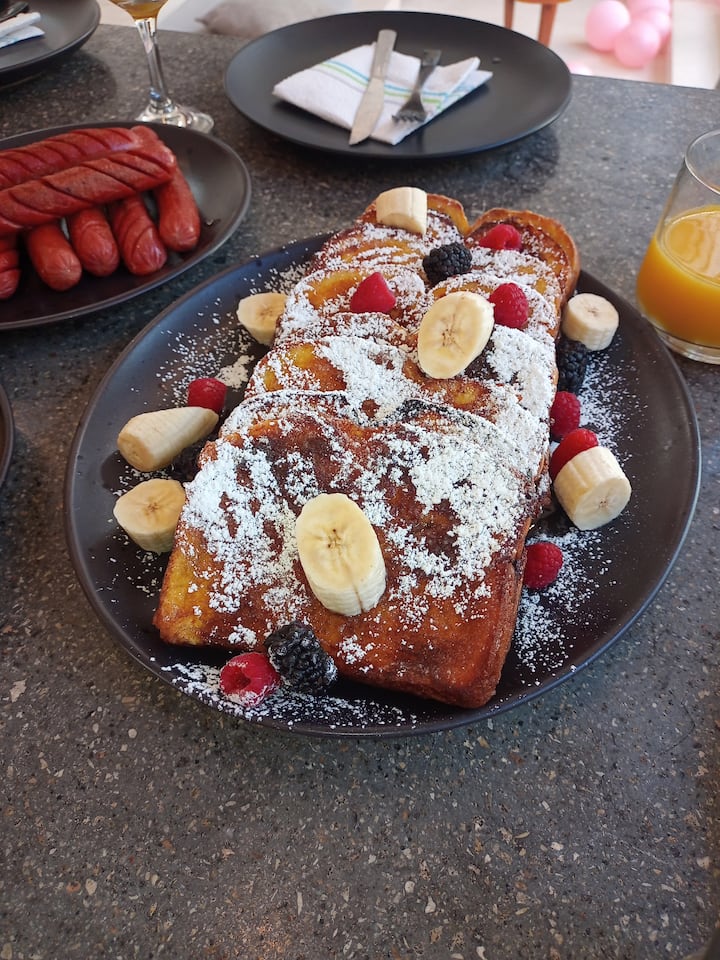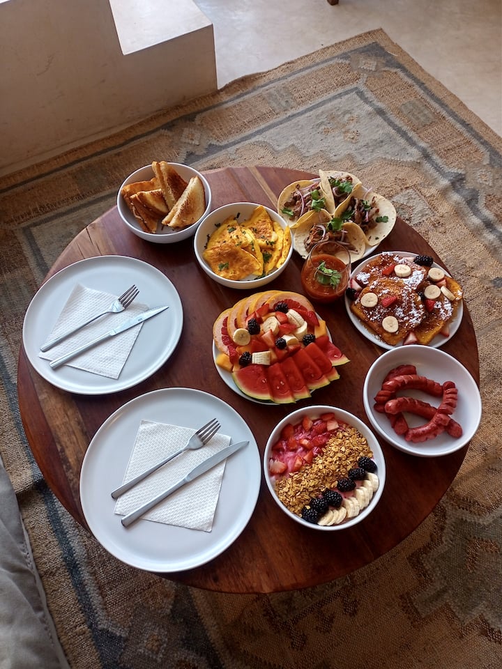 Tacos d'arrachera, toasts français, bacon, saucisses, fruits, œufs, jus de fruits et café.