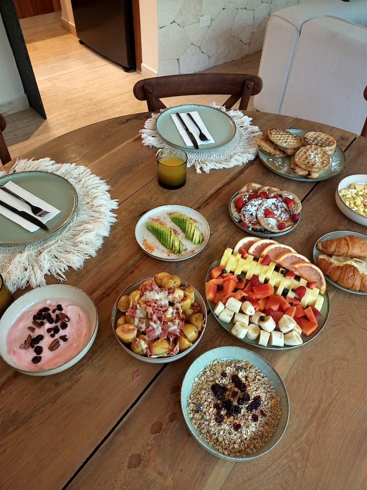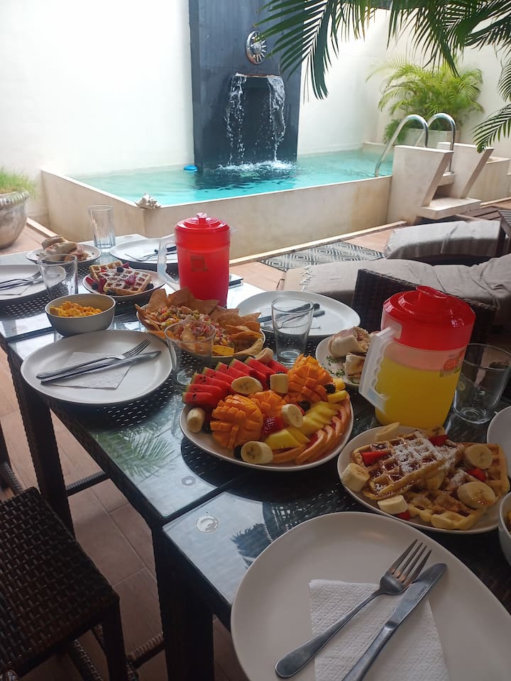 Jus, café, œufs brouillés, sauces, pains, gaufres, ceviche de crevettes, burritos de poulet. MIMOSAS