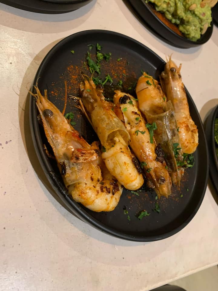 Steak avec sauce chimichurri, crevettes géantes à l'ail, pommes de terre sautées, légumes grillés, frites et sauces. Guacamole
