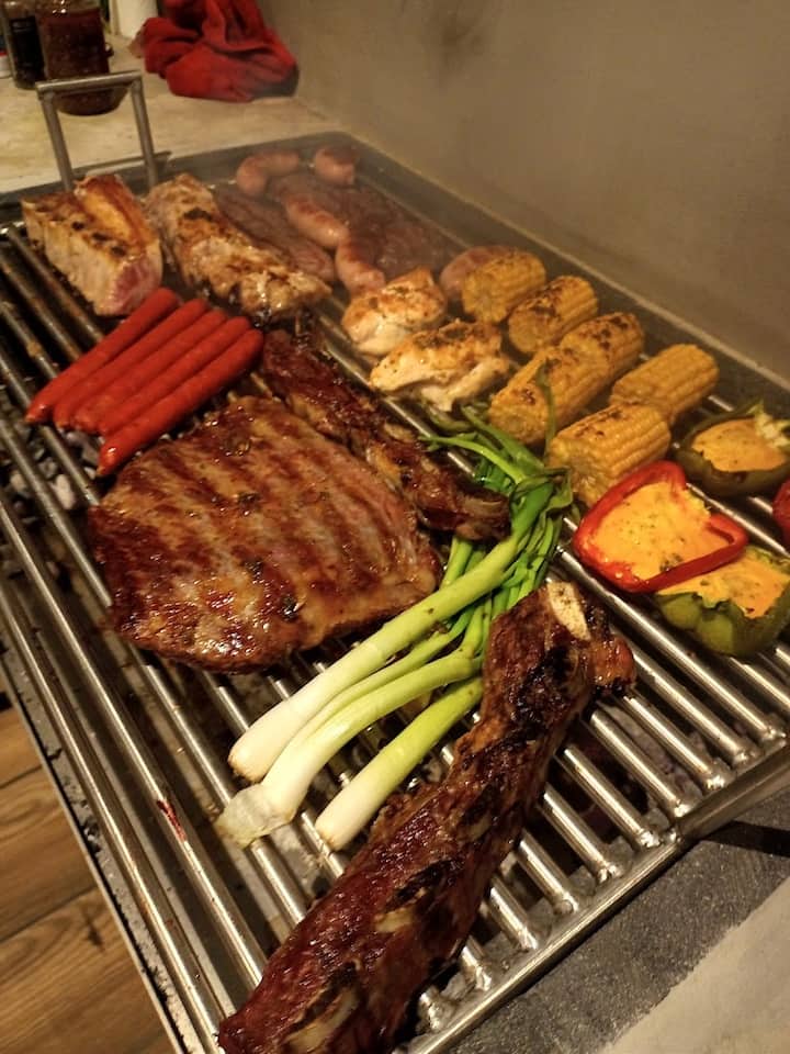 Coupes de bœuf et de poulet, chorizo, accompagnés de légumes. Idéal pour les groupes d'amis et les fêtes au bord de la piscine.