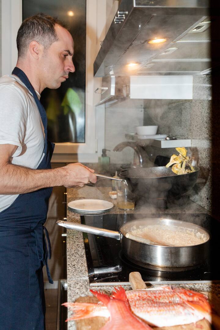 Je cuisine ce qui compte. Plats basques à base de produits frais du jour : kokotxas, poivrons grillés, viandes braisées lentement. Des anchois si piquants qu'ils vous réveillent. Des vins qui méritent d'être servis. Pas de gadgets. Juste un chef, une table, de la vraie nourriture et le genre de compagnie qui vous fait perdre la notion du temps. L'ail est le premier à se faire sentir. Puis le sel. Puis le silence, quand c'est assez bon pour que personne ne parle. Ce n'est pas un spectacle. C'est un repas qui vaut la peine d'être mémorisé.
