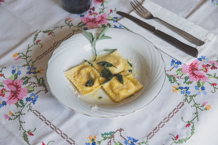Regardez Nonna préparer des raviolis faits à la main. Du pétrissage de la pâte à la fermeture de chaque ravioli à la main, c'est la tradition en action. Choisissez votre garniture et savourez des pâtes faites avec amour.