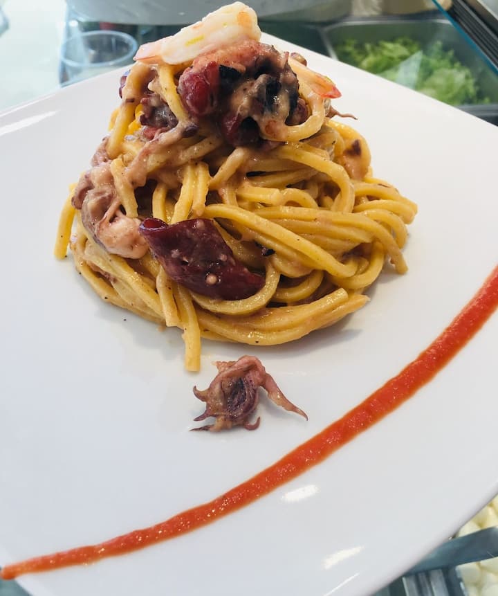 Plats avec du poisson frais sélectionné par le chef Massimiliano, le menu comprend 4 plats de l’entrée au dessert. Boissons non comprises