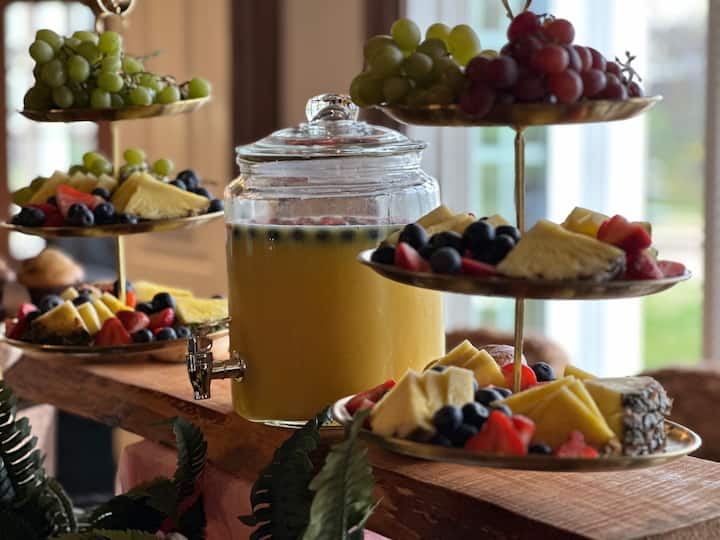 Découvrez notre brunch signature saisonnier dirigé par un chef avec un service élégant à l'assiette ou de style buffet. Notre brunch et bulles comprend un menu saisonnier organisé, des ingrédients frais d'origine locale lorsqu'ils sont disponibles, deux bouteilles de champagne et des mélanges de jus de fruits. Le prix comprend le coût de la nourriture, le service de chef professionnel, le voyage, l'installation, le service, le nettoyage et les frais Airbnb pour une expérience de luxe sans accroc. Le personnel de service, la mixologie, la massothérapie et les améliorations personnalisées sont disponibles pour un investissement supplémentaire.