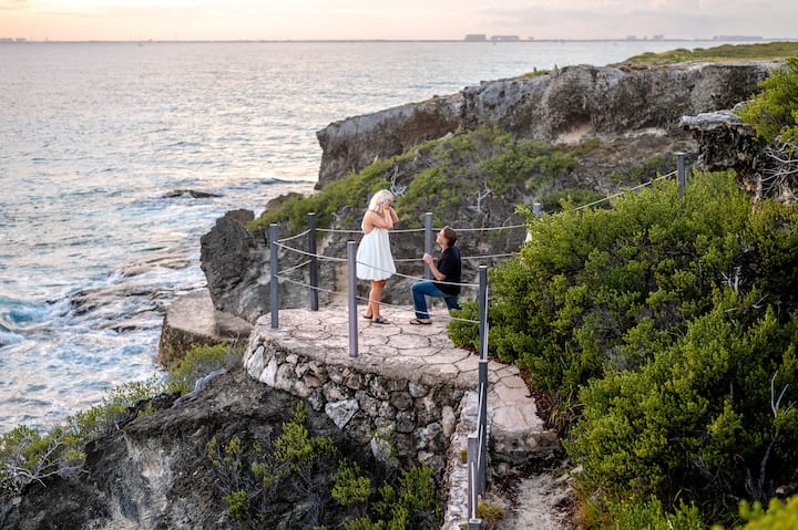 Nous passerons environ une heure et demie à explorer les beaux coins d'Isla Mujeres dans une séance détendue de style documentaire faite pour les couples amoureux. Et au moment parfait, nous terminerons à l'emblématique falaise de l'Aube, l'endroit le plus magique pour faire la demande.