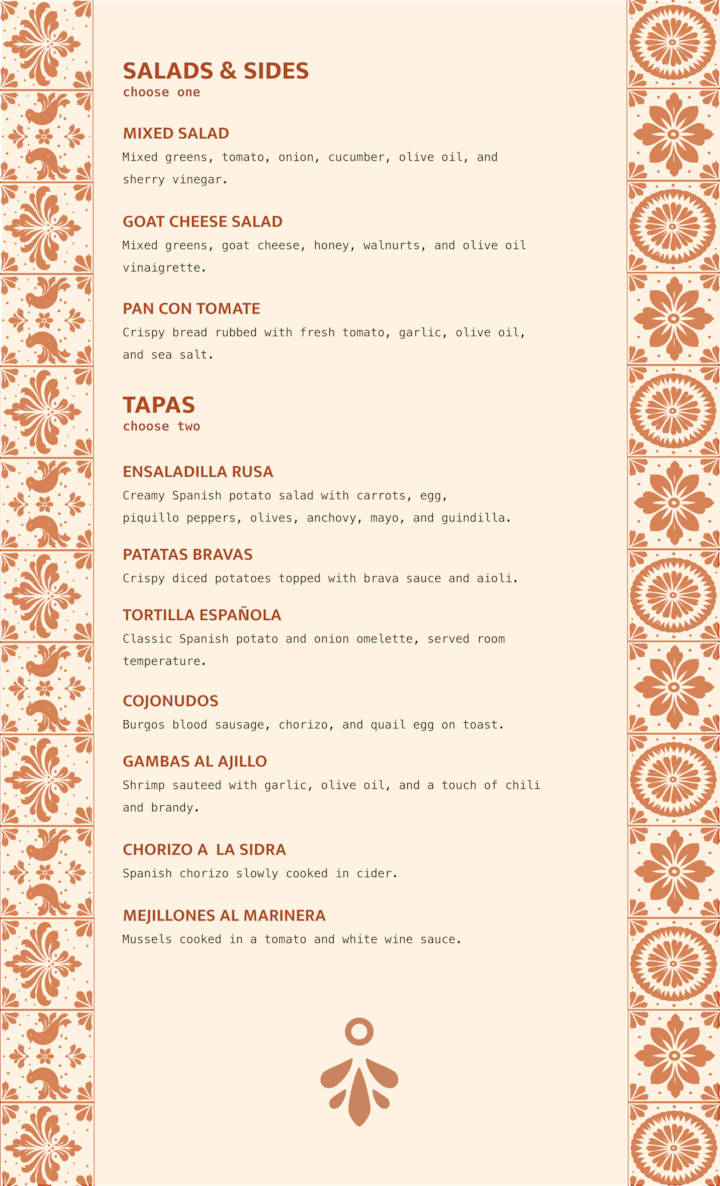 Comprend 1 salade ou accompagnement + 2 tapas + 1 paella + dessert. Ajouts disponibles.