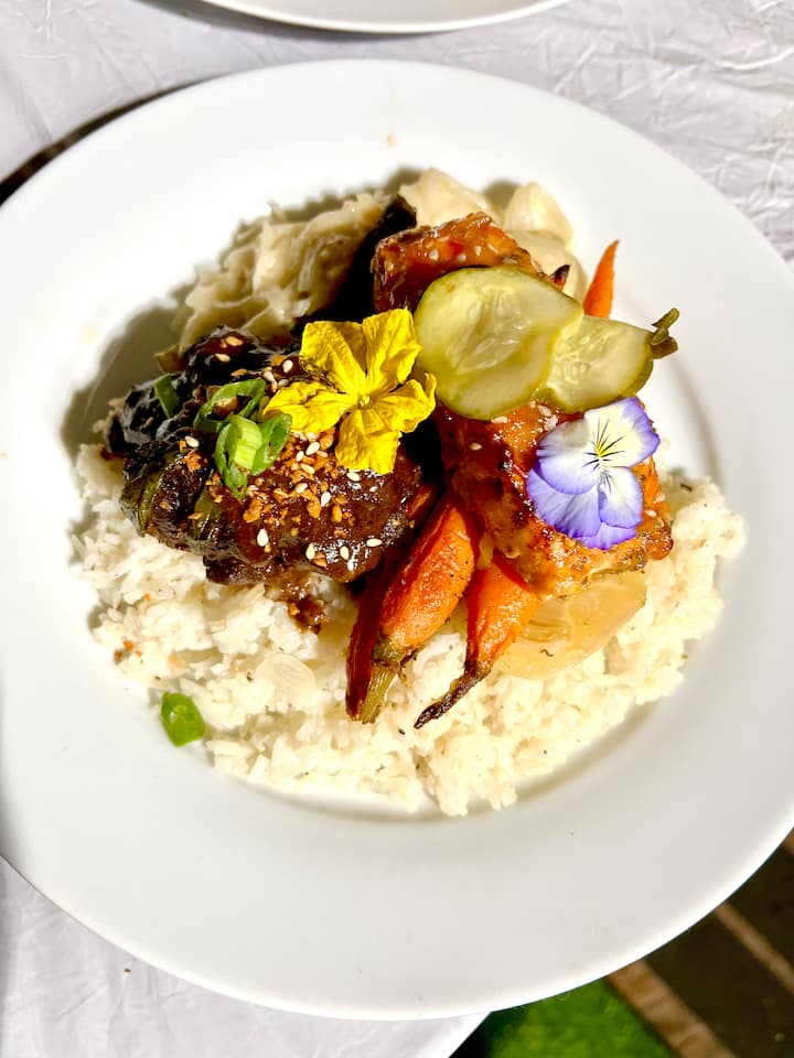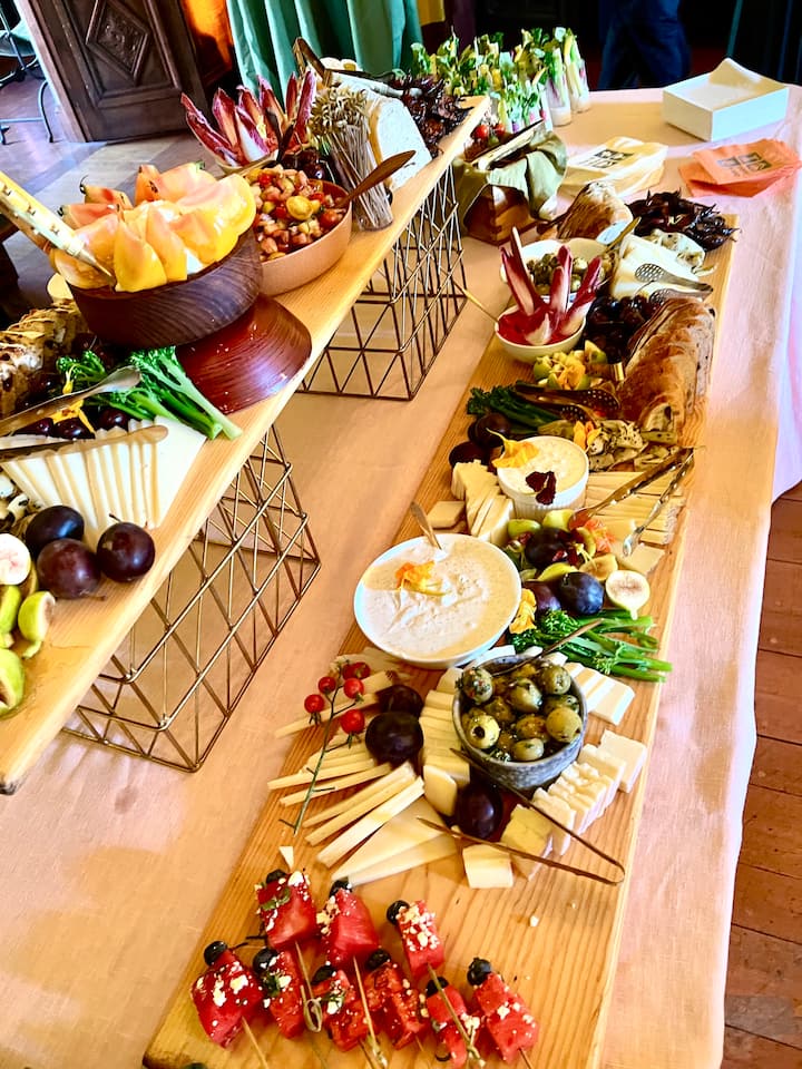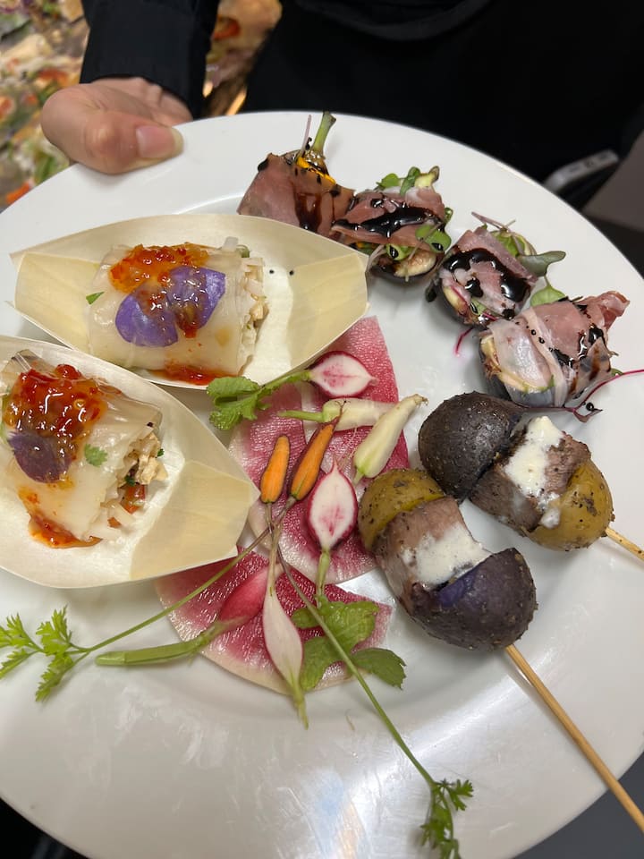 Rib Eye and Fingerling Potato Skewers/Bacon Wrapped Dates and Pecorino/Psychedelic Vegan Spring Rolls