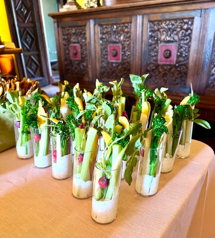 Magnifiques légumes de saison avec une déesse verte. Ils sont servis dans des gobelets transparents pour que vous puissiez voir les légumes et tremper.