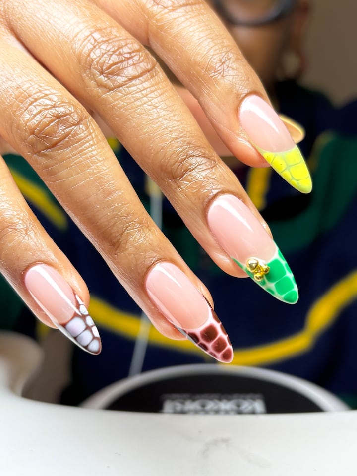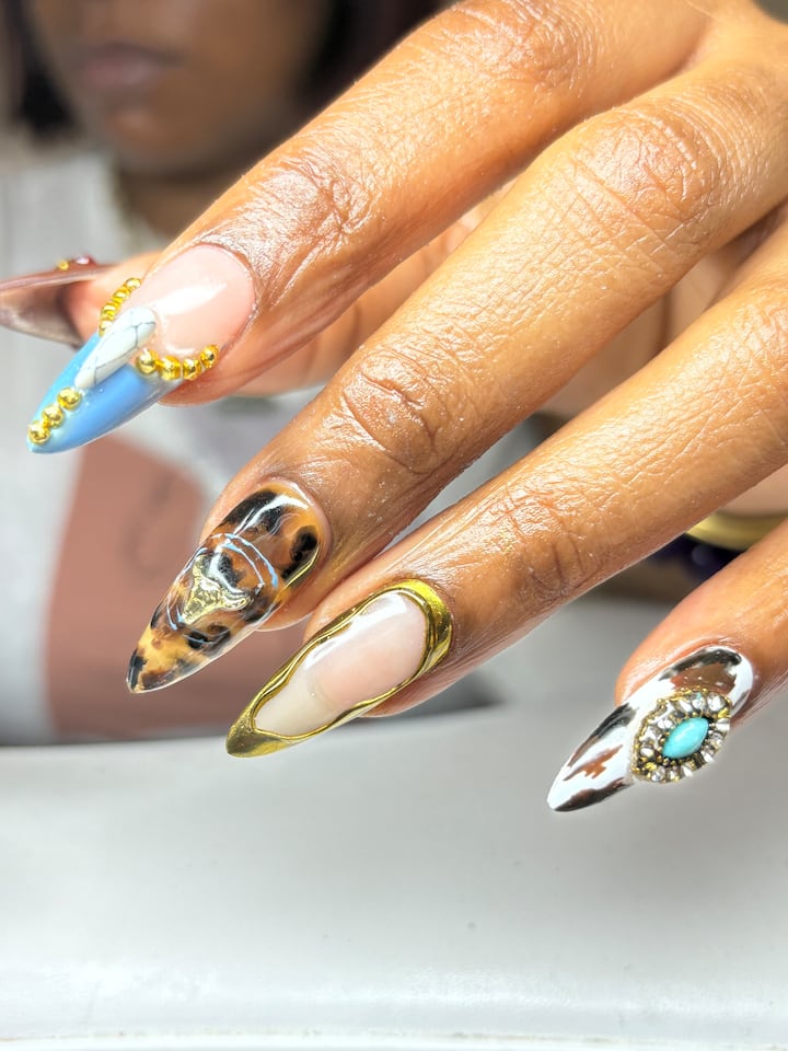 Ce service comprend des designs d'art des ongles modérés qui incluent : français avec des designs, art abstrait, designs avec des breloques, etc. Vous pouvez utiliser jusqu'à cinq couleurs.