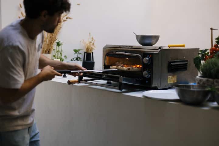 Garnissez votre pizza en fonction de vos envies, nous vous aiderons à la cuire avant que vous ne puissiez déguster votre création.