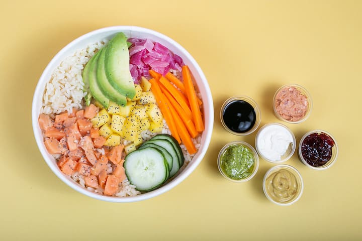 1 Pokè regular (750 ml) ou 1 salade savoureuse + 1 jus de fruits.