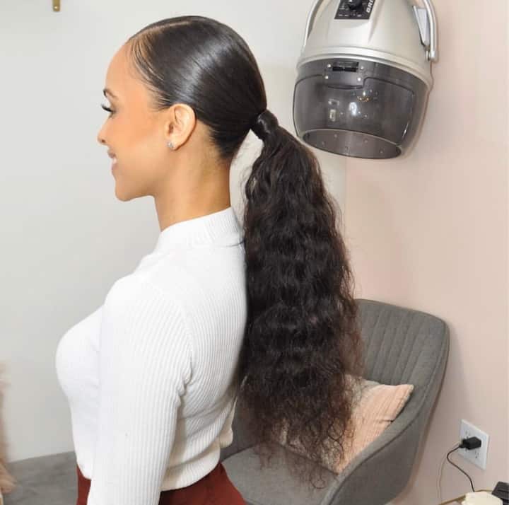 Coiffure sur cheveux lavés, séchés et lissés en une belle queue de cheval. Extensions non incluses.
