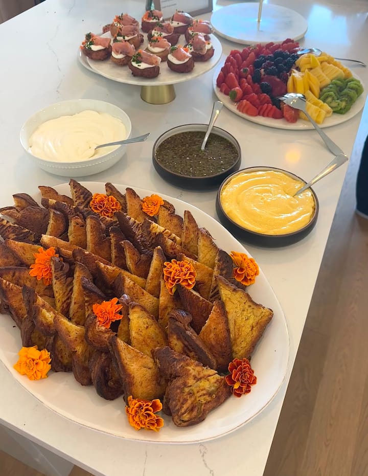 Savourez un brunch buffet plein de saveurs et de bouchées incroyables. Je vais tout cuisiner hors site et vous l'apporter pour que vous puissiez en profiter. Les plats peuvent inclure des croissants, du pain doré, de la focaccia de la ferme, des crêpes de pommes de terre croustillantes avec de la crème fraîche et du saumon local de la région de la baie. Épatez vos voyageurs avec un beau brunch.
