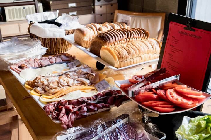 Cette tartinade comprend un assortiment de pains frais, de charcuterie de qualité supérieure, de fromages en tranches et une variété de garnitures et de condiments.