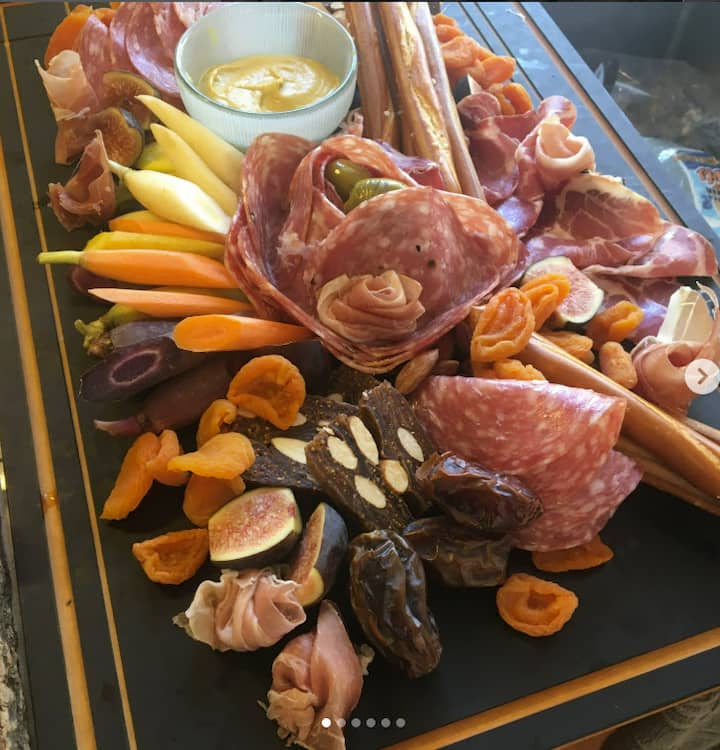 Cette magnifique planche comprend de la charcuterie, des fromages artisanaux, des fruits frais et secs et des accompagnements de saison. La sélection de fromages artisanaux change selon la saison.