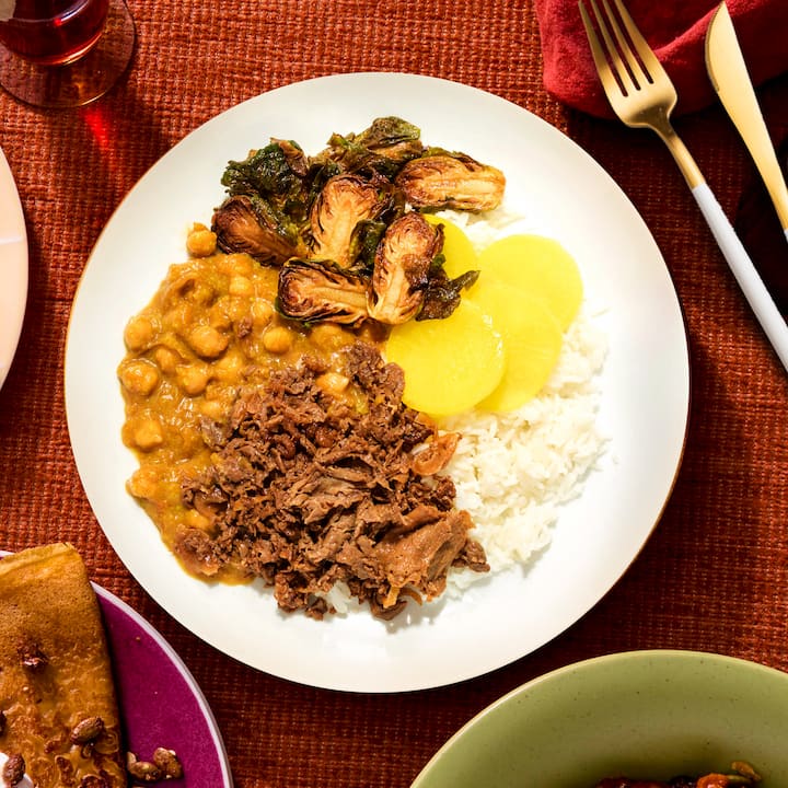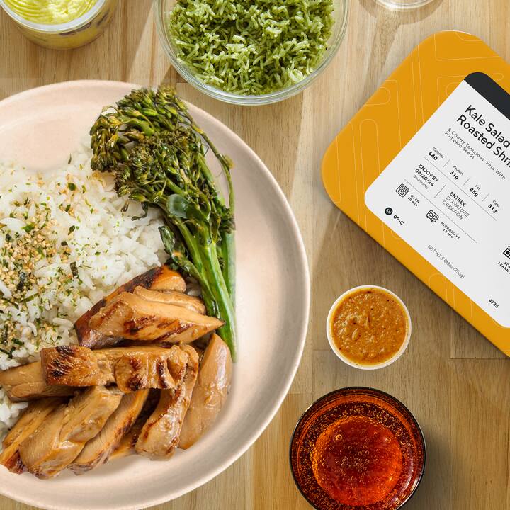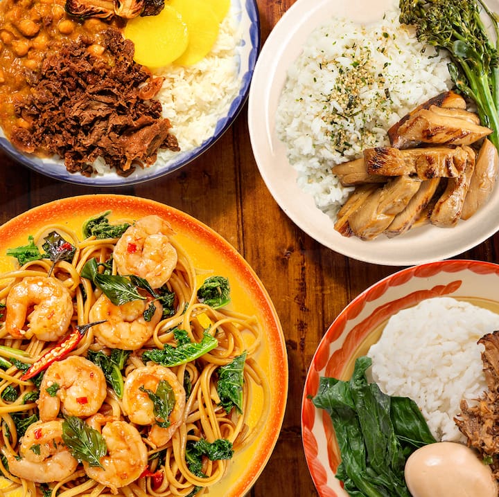Une visite guidée des saveurs asiatiques par un chef, avec le poulet teriyaki d'Esther Choi (poulet glacé avec riz furikake et broccolini), les linguines aux crevettes thaïlandaises de Hong Thaimee (mélangées à une sauce au piment thaï à l'ail), le curry japonais de Sergio Tominaga (avec pois chiches et choux de Bruxelles dans un curry épais sur du riz) et l'épaule de porc braisée de Yong Zhao et Wanting Zhang (servie avec du yu choy, du riz et un œuf mariné au soja). Comprend 1 de chaque repas.