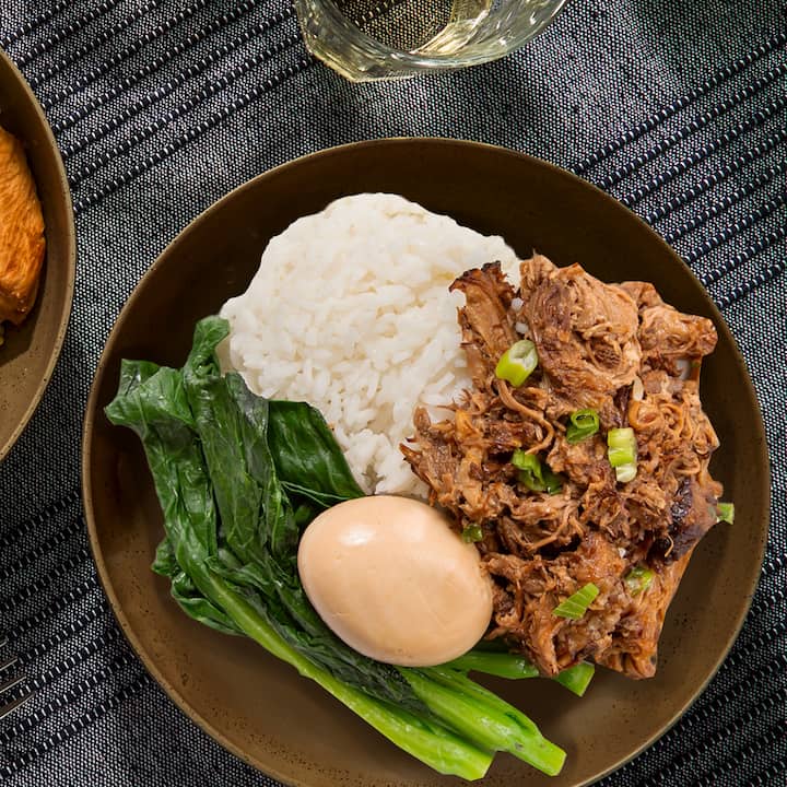 Les chefs Yong Zhao et Wanting Zhang braisent lentement l'épaule de porc dans de la sauce soja et des épices chinoises chaudes, puis la servent sur du riz blanc avec du yu choy et un œuf mariné au soja. Profondément savoureux et ultra-satisfaisant. Comprend 1 repas par voyageur.