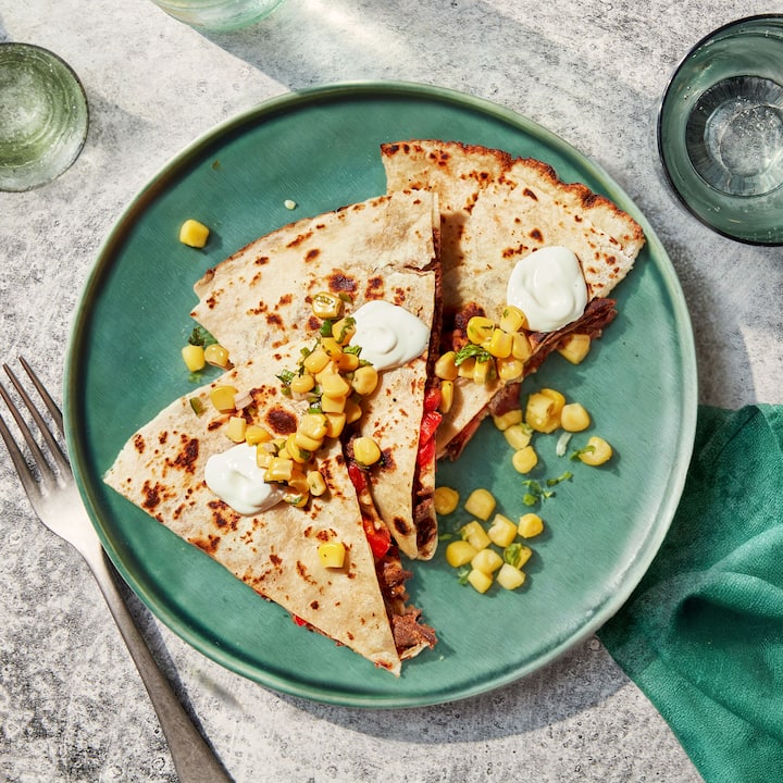 La cheffe Esther braise de l'épaule de bœuf désossée avec des saveurs fusion mexicaines-coréennes, puis glisse le bœuf fondant dans une tortilla de farine croustillante garnie de fromage fondant et de poivrons rouges rôtis. Servi avec une crème sure acidulée infusée de lime et une salsa de maïs frais, c'est la nourriture réconfortante à un autre niveau. Comprend un repas de quesadilla au bœuf coréen par voyageur.