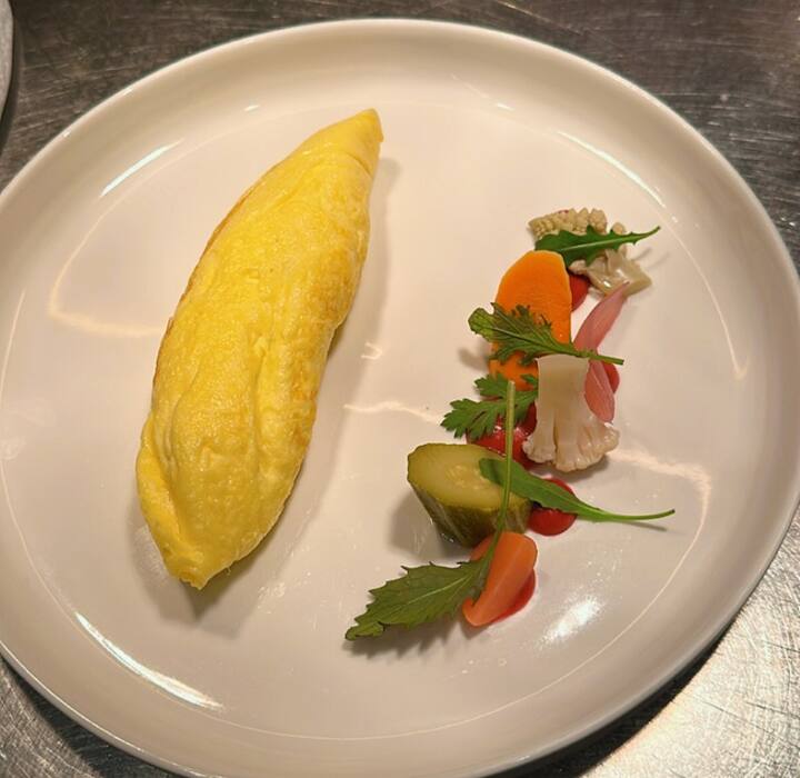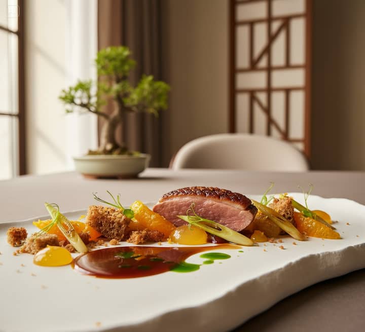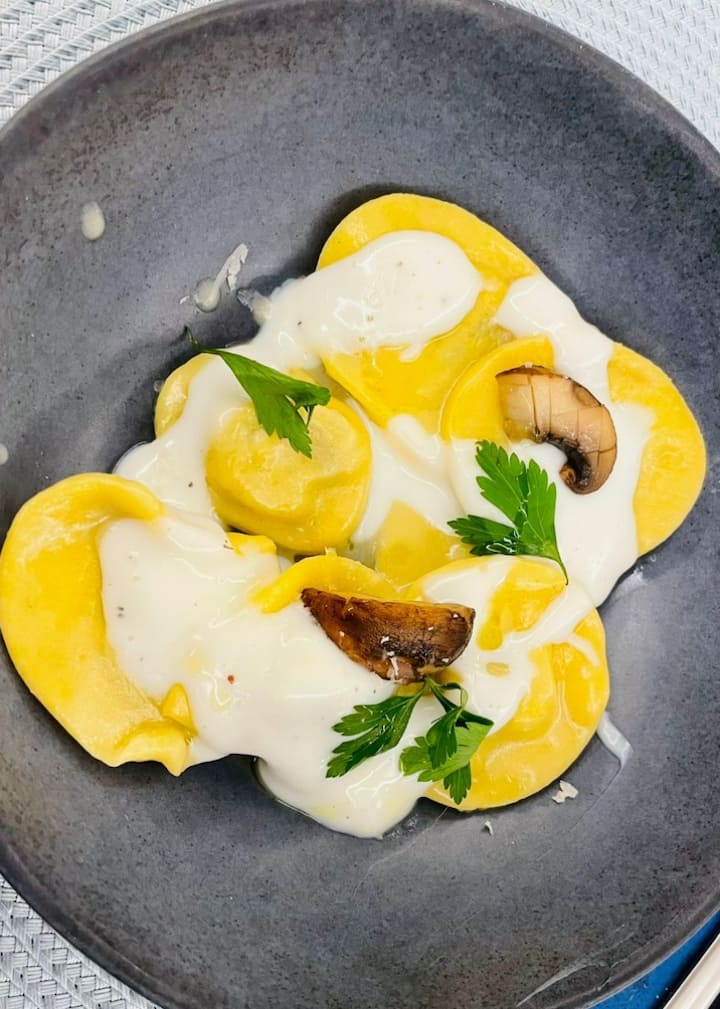 Un voyage culinaire autour du monde avec un menu qui vous permet de choisir 2 plats pour chaque service : de l'apéritif avec Caprese et Egg royal, au premier avec des pâtes à la tomate et des raviolis aux champignons, jusqu'au deuxième avec du canard à l'orange et du poulet à la cacciatora, pour terminer avec des desserts comme Pavlova et Pastel de Belem.