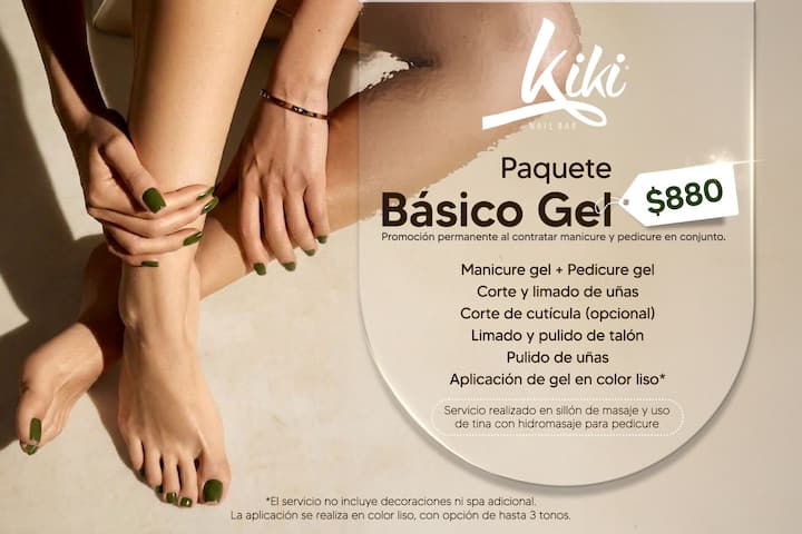 Ce forfait comprend une manucure et une pédicure au gel, avec préparation et finition durable. Comprend la coupe et le limage des ongles, le soin spécialisé des cuticules, le polissage conventionnel et le polissage du talon, ainsi que l’application de gel de couleur unie (jusqu’à trois teintes unies, ne comprend pas les décorations).