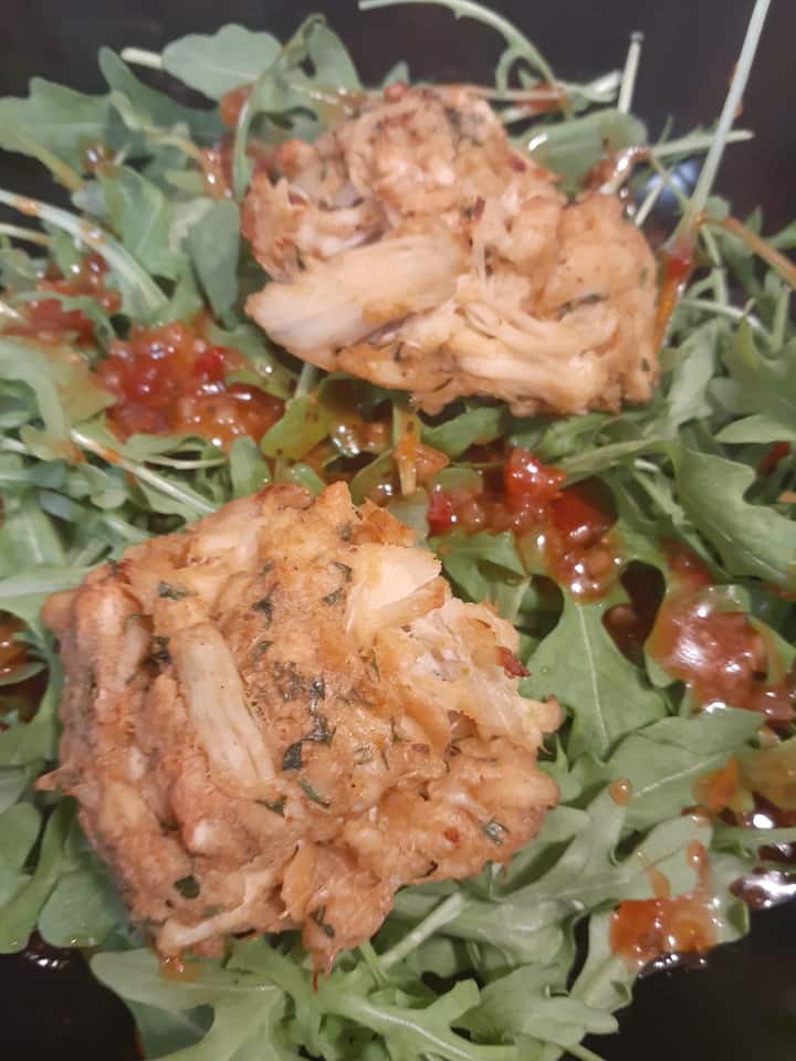 Délicieux pains de crabe sur un lit de roquette, nappés d'une sauce au poivron rouge