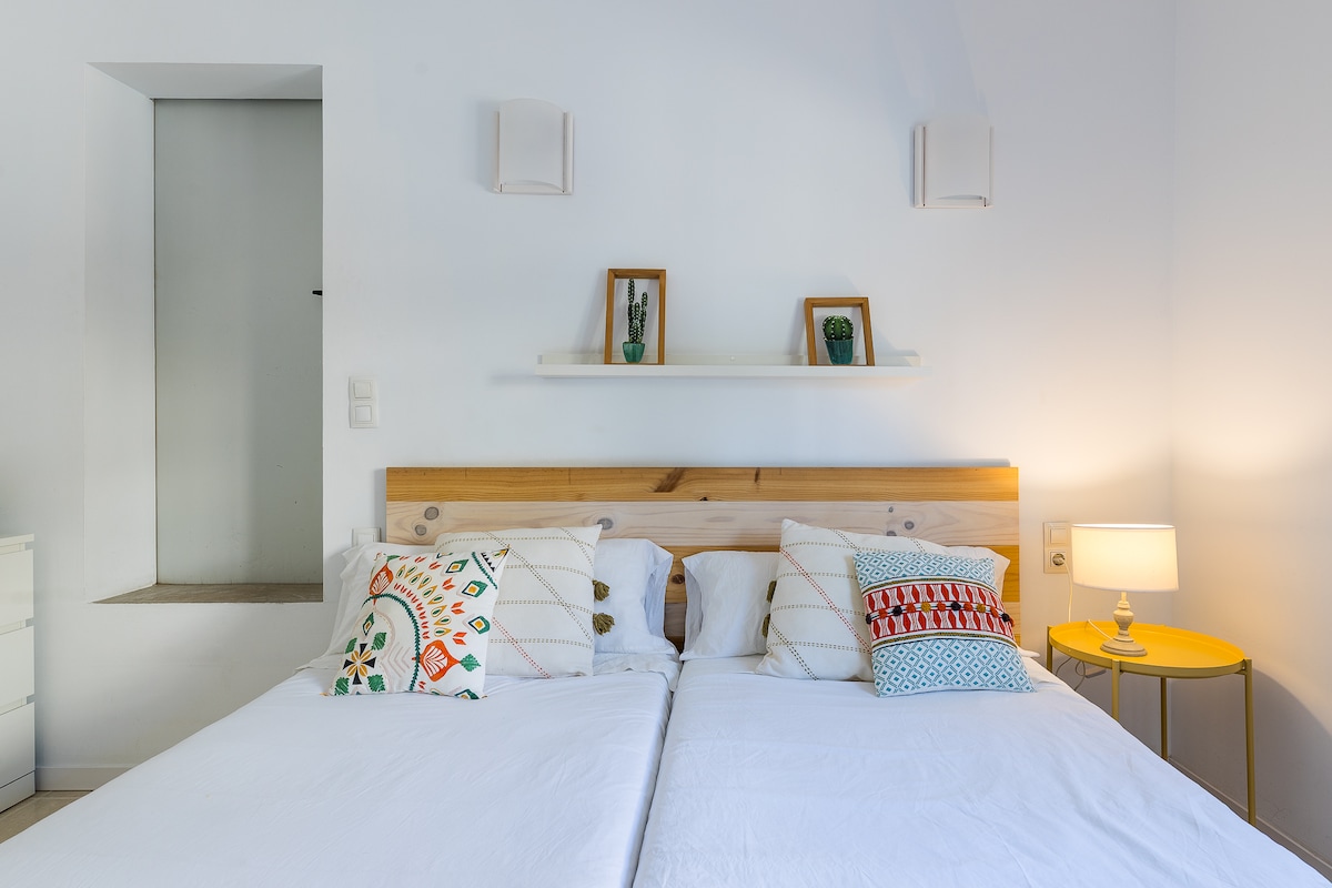 60 m² avec une chambre, une salle de lecture et un salon. En plein centre historique, à quelques minutes à pied de partout. Parfait pour les couples, peut également accueillir des enfants de moins de 15 ans : lit de 150 cm, lit junior et lit bébé. 2 autres logements dans le même bâtiment, tous appartiennent à Poc a Poc Suites turismo interior. Entièrement équipé : climatisation, chauffage, Wi-Fi, TV-DVD, lave-linge séchant, lave-vaisselle, micro-ondes, équipement de cuisine. Les escaliers de notre immeuble sont un peu raides comme la plupart dans la vieille ville, pas d'ascenseur.