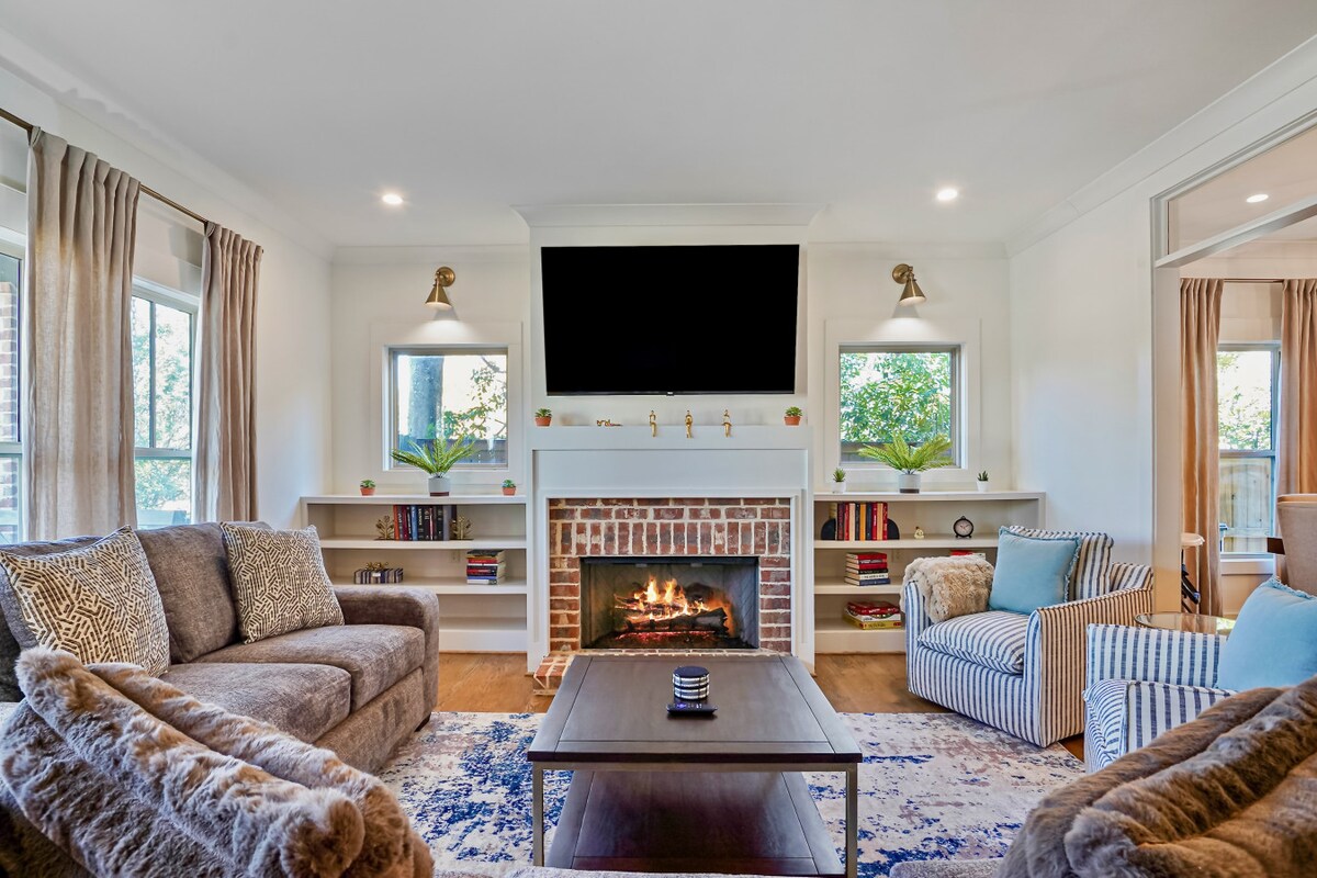 Escapade printemps-été dans le parc Southside Highland de Birmingham ! Maison rénovée à quelques minutes des restaurants et de la vie nocturne. Peut accueillir 6 personnes avec 1 lit king et 2 lits queen (matelas Leesa), 1 salle de bain, un salon confortable avec foyer au gaz et une cuisine entièrement équipée avec Keurig. Profitez d'une immense terrasse privée avec des sièges, un barbecue, un foyer extérieur, une table pour 6 personnes et une vue sur la ville. Laveuse/sécheuse, draps, matelas gonflable et chargeur pour véhicule électrique sur demande. Les voyageurs ont accès à l’étage principal du logement, à la terrasse et à un stationnement privé.