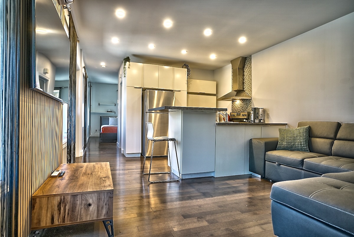 ***PROMOTION février 2025 Louez 3 nuits consécutives et nous vous rembourserons 10% du montant total de votre réservation.*** Superbe petit bachelor de 300pi2 intime et tout meublé à proximité de tous les services. Planchers chauffants, douche en céramique avec jets masseurs, cafetière Kurig, literies et cuisine autonome. Plaques à induction et Air Fryer. Wi-fi et Télévision intelligente. « Bell télé Fibe » disponible. Restaurants, épicerie, dépanneurs, pistes cyclable à proximité.