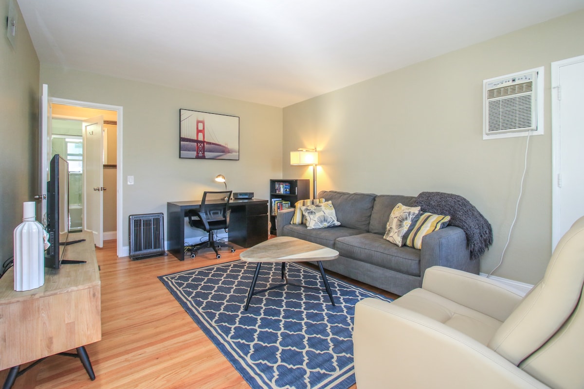 Appartement moderne d'une chambre avec des finitions haut de gamme, un lit Queen Size confortable, une salle de bains privée, une cuisine équipée, un bureau adapté au travail, une connexion Wi-Fi haut débit, la télévision par câble, un système de chauffage et de climatisation et une cour latérale bordée de fleurs. Situé dans un quartier sûr et agréable. Emplacement idéal pour les voyageurs de la région de la baie, avec un trajet facile vers toutes les grandes entreprises de haute technologie, à distance de marche du supermarché, des restaurants et des magasins, et à quelques minutes en voiture du centre-ville de Mountain View et de la gare de Caltrain.