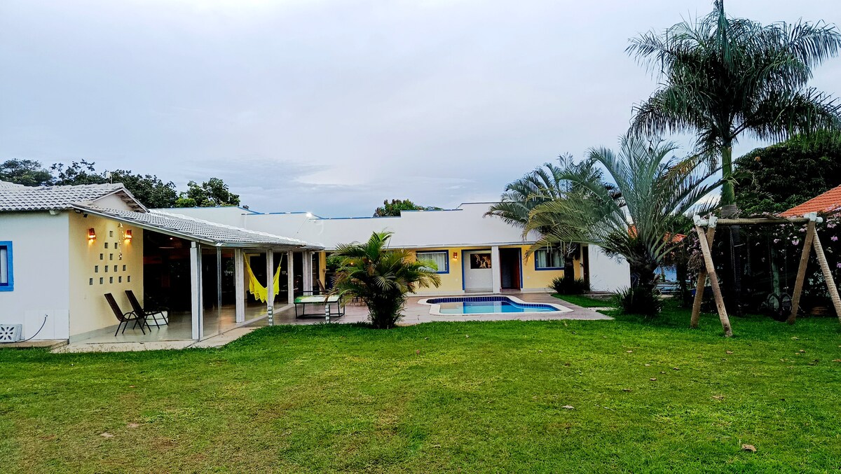 Ranch simple dans un condominium, près du lac Corumbá IV, idéal pour se détendre en famille ou entre amis. Il y a une piscine chauffée, un barbecue, un lave-vaisselle et un grand espace extérieur. 📍20 km de chemin de terre 🔇Voiture silencieuse 🎵 Musique à volume modéré seulement. La piscine est déjà équipée de haut-parleurs. Le ranch peut accueillir 14 personnes, idéal pour les familles et groupes d'amis. 🐾 Nous acceptons les animaux de compagnie, n'oubliez pas de les inclure lors de la réservation, il y a des frais.