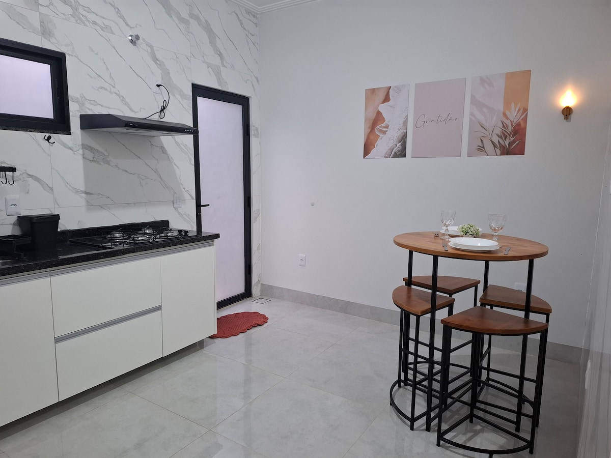 Situé dans l'espace Zion Anápolis, le studio offre un lit queen-size, un bain à remous privé donnant sur le jardin, la climatisation, une télévision et une cuisine complète. Il y a une petite sélection de vins dans la cave que les voyageurs peuvent choisir. Profitez du jardin, du verger et des arbres indigènes. Détendez-vous au bord des piscines, des kiosques ou du foyer. Idéal pour ceux qui recherchent la tranquillité avec une touche contemporaine.