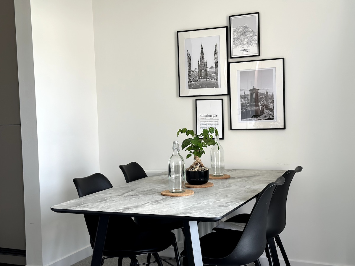 Cet appartement moderne, achevé en 2023, est idéalement situé à proximité du centre-ville d'Édimbourg (10 min) et de l'aéroport (20 min). Dans cet appartement lumineux et aéré, vous trouverez : - De vraies plantes ! - 1 grand lit King Size et 1 canapé-lit King Size - Matelas Emma super confortable, linge de lit à fils de haute qualité et serviettes douces - Machine à café Nespresso - Lave-linge/sèche-linge/ lave-vaisselle - Sèche-cheveux - Télévision connectée 65pouces et jeux de société - Garde-manger avec riz, pâtes, ramen, granola, lait ordinaire et d'avoine - à 15 minutes à pied de la plage