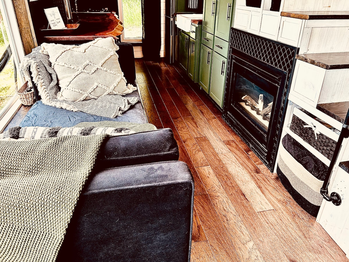Découvrez la beauté simple et la tranquillité de Living Tiny, entouré de douces collines verdoyantes. Sirotez une tasse de café tout en admirant la verdure depuis le salon ou la terrasse arrière. Détendez-vous dans un hamac, méditez ou écrivez, explorez la propriété de 80 acres ou détendez-vous sur la terrasse arrière près du foyer extérieur. Profitez d'une vue imprenable sur les étoiles depuis le jacuzzi extérieur. Entrez après avoir profité de la nature et détendez-vous avec un verre de vin dans une petite maison élégante et moderne. Une escapade parfaite et paisible.