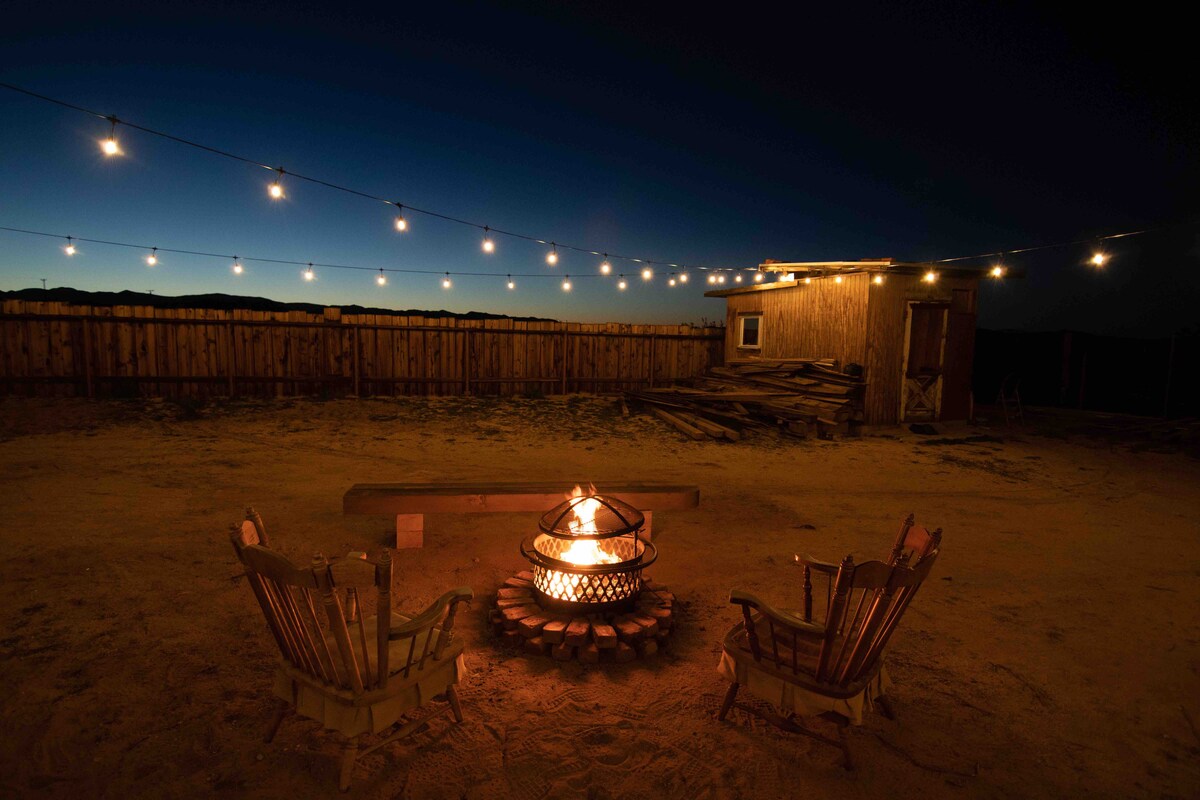 Niché une colline surplombant la vallée, vous vous léverez avec un ciel coloré en buvant votre café matinal sous la pergola avec vue sur la montagne. Faites une promenade sur l'un des sentiers à proximité dans la paix et la tranquillité. Explorez la vieille ville de Yucca Valley, Pioneer Town et Joshua Tree. Rentrez à la maison pour admirer le coucher de soleil autour d'un feu de camp et cuisinez un bon repas au barbecue. Voilà votre journée parfaite dans notre maison de cow-boy contemporaine.