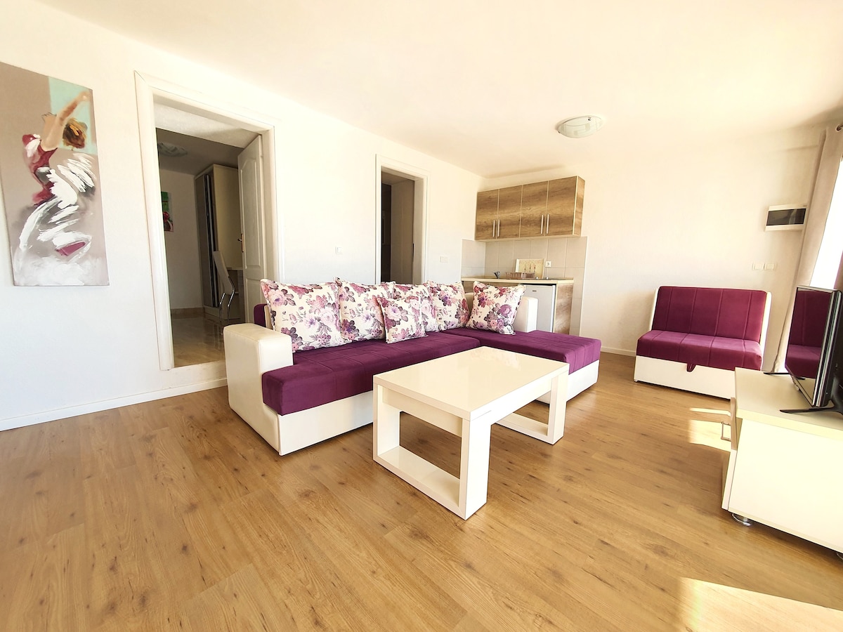 Ce logement unique a un style qui lui est propre. Entièrement équipé de manière minimaliste, avec une couleur neutre, il vous offre des conditions supplémentaires pour vos vacances anti-stress, ainsi qu'un bel endroit pour vivre de longs séjours, avec des espaces pour travailler, cuisiner et se reposer. Nous sommes dans un quartier calme, mais à distance de marche du centre-ville, de la vieille ville et des plages. Nous sommes également à côté de la forêt de pins, donc même les jours les plus chauds, nous avons de l'air frais. Nous sommes également à seulement 300 mètres de la plus grande oliveraie (Valdanos) du Monténégro.