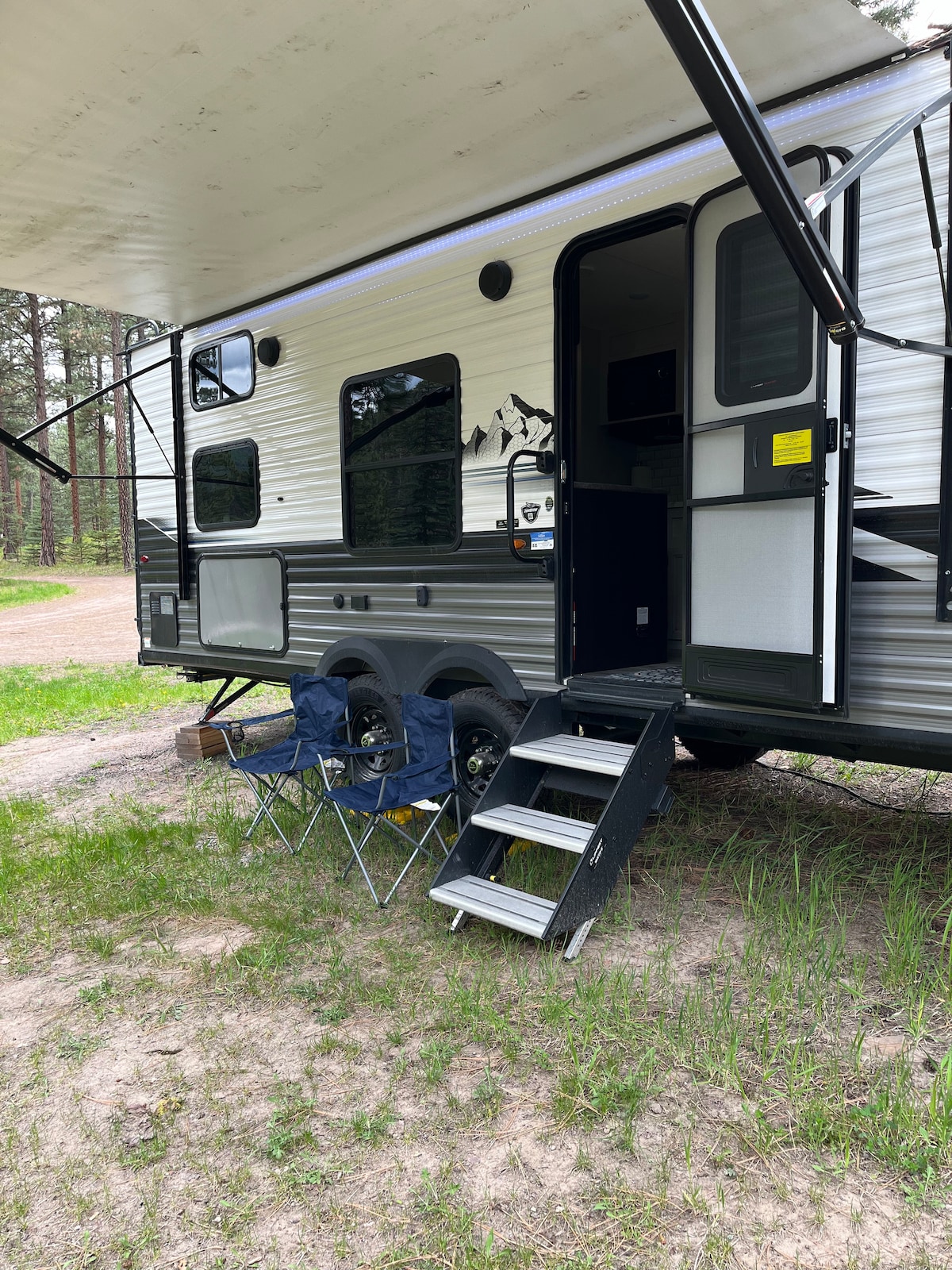 Ce camping-car est plus confortable pour 2 adultes et 2 enfants, car 2 lits sont des lits superposés, 32" x 70". La table se transforme en lit presque complet, idéal pour 1 adulte et il y a un lit Queen Size très confortable avec une porte d'intimité. Toutes les commodités sont là, sauf un lave-linge/sèche-linge. Il y a une cuisinière à gaz et un four, un barbecue au propane, un réfrigérateur-congélateur, le chauffage et la climatisation, une télévision avec Amazon Firestick et des DVD, une table, des chaises, des rockers et des rôtissoires pour se détendre autour du feu de camp. De belles vues, des couchers de soleil, la faune et les oiseaux vous attendent !