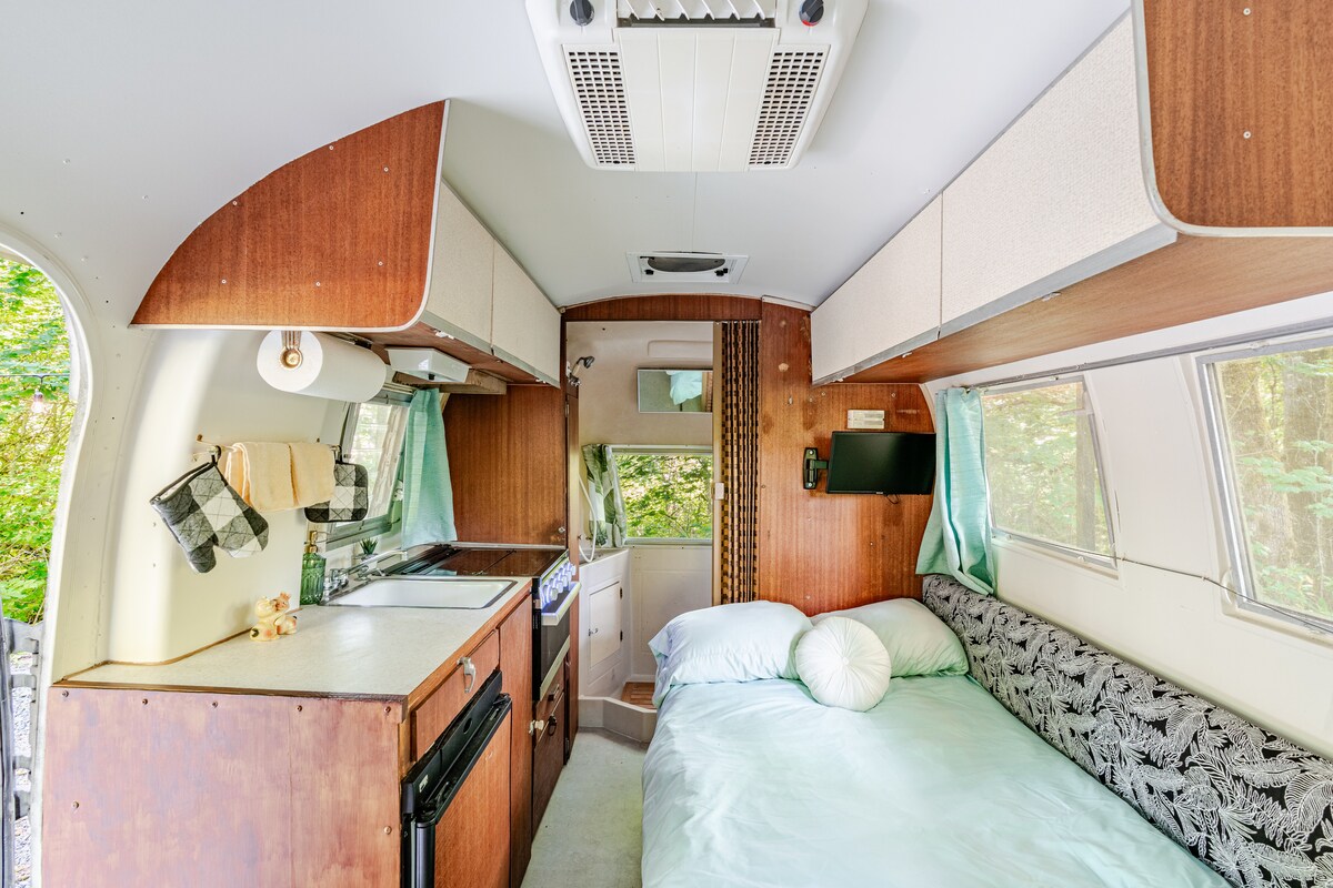 Vous adorerez cette escapade privée à la campagne, à côté de notre ferme biologique tranquille. Caravane Airstream Caravel vintage emblématique nichée dans les bois avec cour comprenant un foyer et un stationnement. Cette rare caravane antique a été entièrement restaurée avec tous les meubles d'origine et les intérieurs en acajou. Détendez-vous et ressourcez-vous lors de cette aventure de glamping fantaisiste.