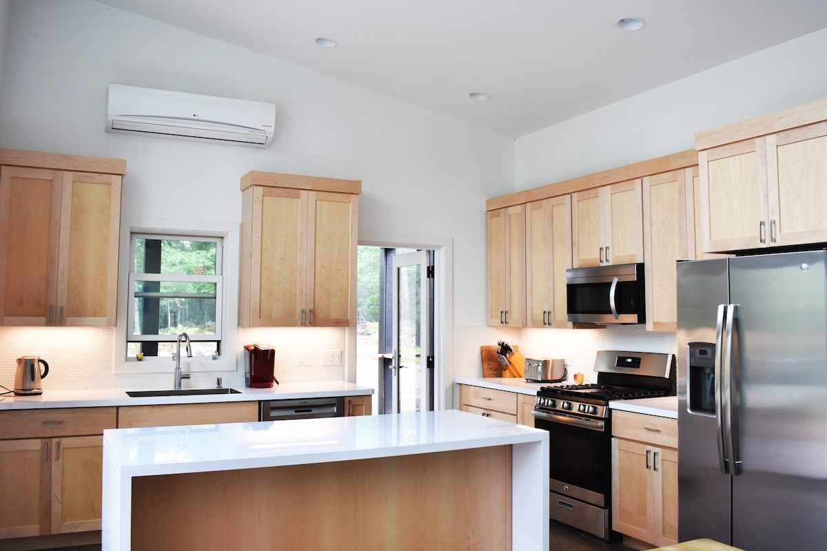 Cabane moderne, rustique, Aframe sur 10 acres boisés; beau décor simple, cuisine entièrement équipée, tous les appareils électroménagers, cuisinière en verre, four à air chaud, machine à glaçons H2O filtrée. Profitez d'une salle de bain luxueuse, avec un carrelage chauffant et une douche à l'italienne. Serviettes, shampooing/revitalisant/gel douche sont fournis. Lit king size dans le loft et NOUVEAU lit king size en mousse à mémoire de forme au rez-de-chaussée. Télévision connectée, wifi. Livres, jeux Le poêle à bois chauffe parfaitement la cabane pendant les mois les plus froids. Tout le bois est fourni. Il y a un mini-thermopompe.