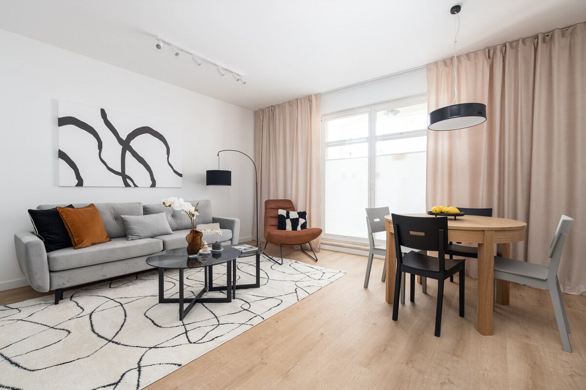 Profitez d'un séjour paisible et élégant dans ce logement central. Un appartement nouvellement construit et joliment meublé, parfait pour un séjour au calme au cœur de Gdańsk. Situé sur le côté le plus vert du centre-ville, juste à côté de Góra Gradowa. Bien que les sites historiques et culturels, les boutiques et les restaurants ne soient qu'à 10-15 minutes à pied, le quartier est paisible et isolé. L'endroit offre un design unique, chaleureux et très confortable, parfait pour un couple et une escapade de week-end.