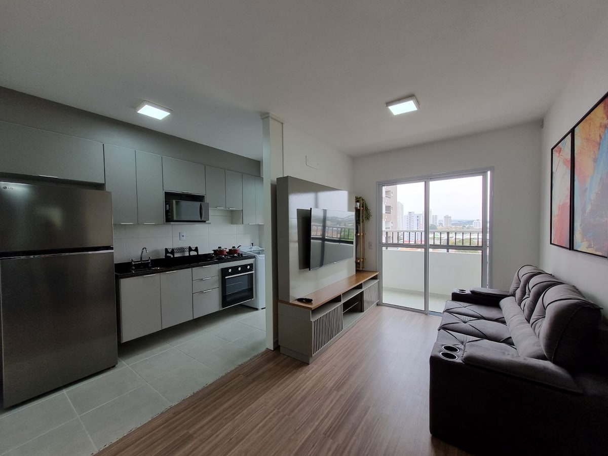 Élégant appartement avec un excellent emplacement avec 2 balcons et une vue panoramique à 360º donnant sur l'autoroute Raposo Tavares à 1,4 km du parc Campolim 3,4 km du centre commercial Iguatemi. 1 chambre, 1 salle de bain avec eau chaude avec salle à manger/salon lit queen size avec linge de lit Emplacement central Wi-Fi, TV, climatisation, smart tv 55" cuisine avec airfyer, cooktop et divers ustensiles de cuisine. Check-in flexible Balcon géant avec le meilleur coucher de soleil de Sorocaba. Parfait pour les couples ou les amis"