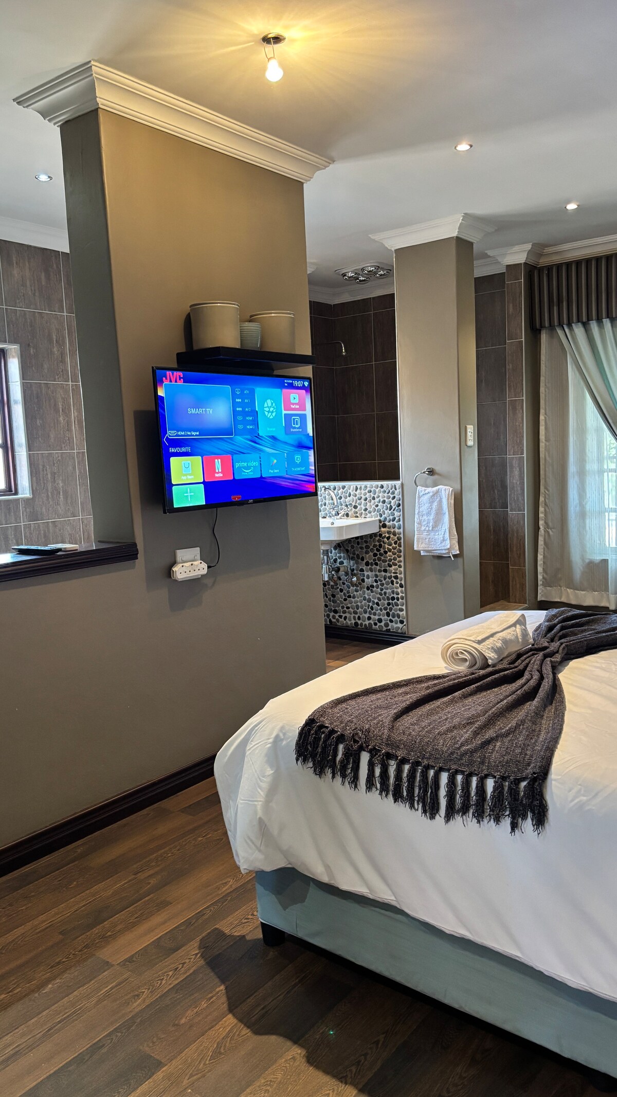Cette maison d'hôtes paisible et sécurisée dispose de deux chambres (queen size et lits jumeaux/king size), d'une cuisine entièrement équipée et d'un salon spacieux avec table à manger et salon. Profitez de divertissements avec DSTV, Netflix et le Wi-Fi gratuit. Un bureau est disponible pour le travail, tandis qu'un chauffage au gaz assure la chaleur les nuits plus fraîches. Détendez-vous sur la terrasse, près de la cheminée ou sous l'acacia pour un braai. Parking sécurisé gratuit, adapté aux enfants, à 5 minutes de l'hôpital Wilgers et d'un centre commercial.