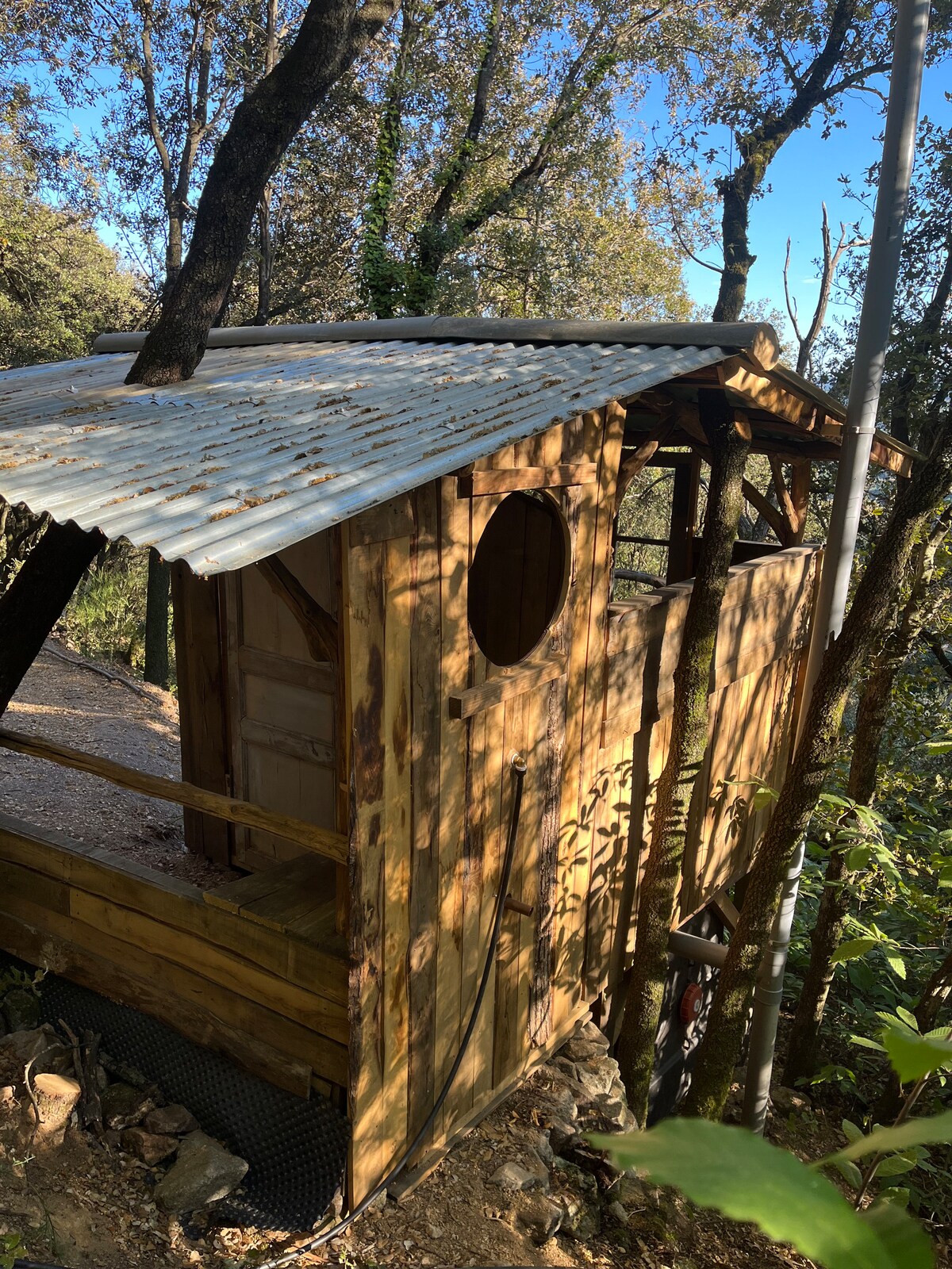 A mi-chemin entre une yourte et une cabane, notre petite maison ronde en bois vous accueille pour un séjour reposant. Vous pourrez profiter du jardin, de la découverte des ruisseaux, forêts et hameaux tout proches ; rejoindre les chemins de randonnées (à 7km) ; ou rallier Saint jean du Gard Lassalle pour profiter des marchés et animations locales (env. 15 km). Pour parfaire la déconnection : le téléphone portable ne passe qu’à 4km. Nous fournissons donc une connexion wifi à la demande.