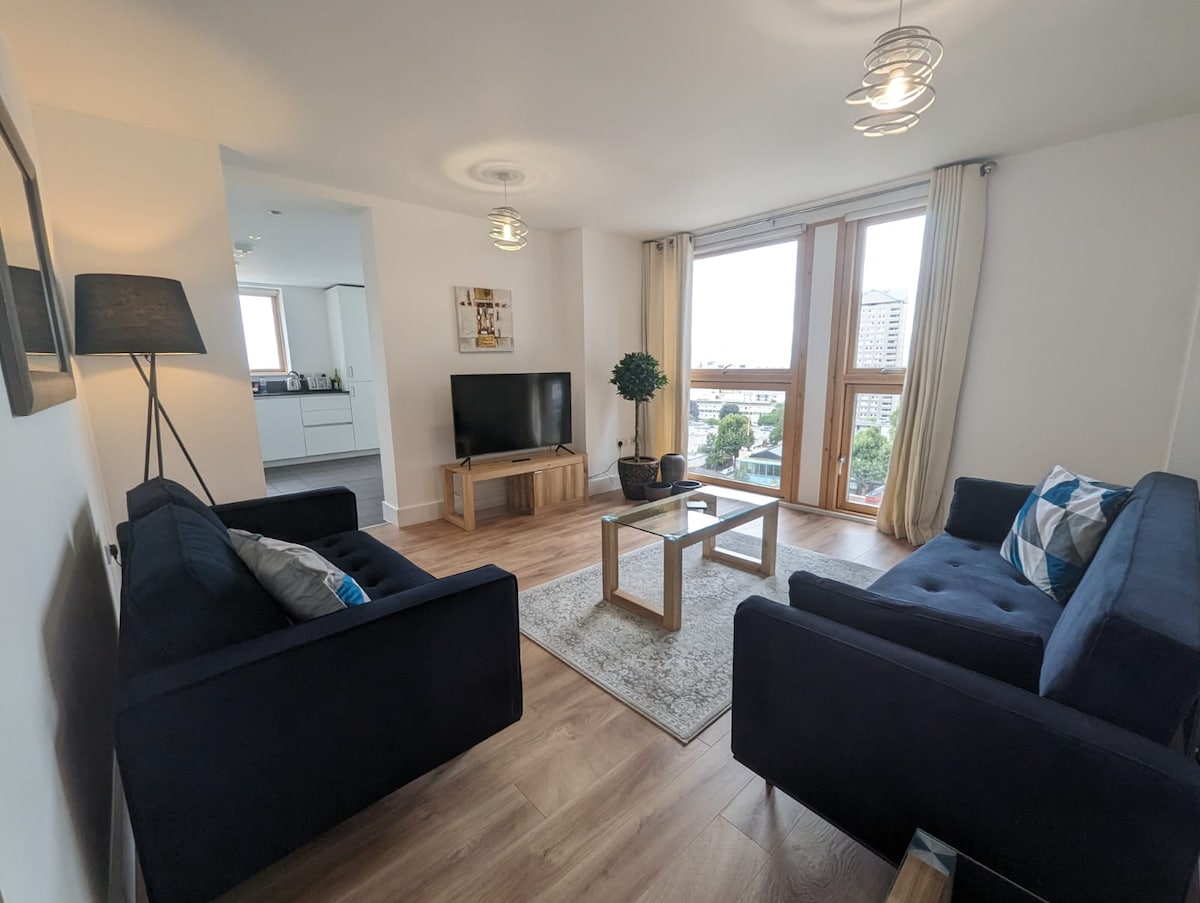 Bienvenue dans notre élégante résidence de 2 chambres à seulement 5 minutes à pied de Canary Wharf. Cette retraite contemporaine spacieuse dispose d'un salon ouvert élégant, d'une cuisine moderne entièrement équipée et d'un immense balcon privé avec une vue imprenable sur la ligne d'horizon, à ne pas manquer! On a choisi avec soin nos draps et nos lits de luxe. Profitez d'équipements exclusifs comme un projecteur, du matériel d'entraînement et un sac de boxe. Entouré des meilleurs restaurants de Londres Pour une configuration de lits jumeaux, veuillez nous en informer lors de la réservation.