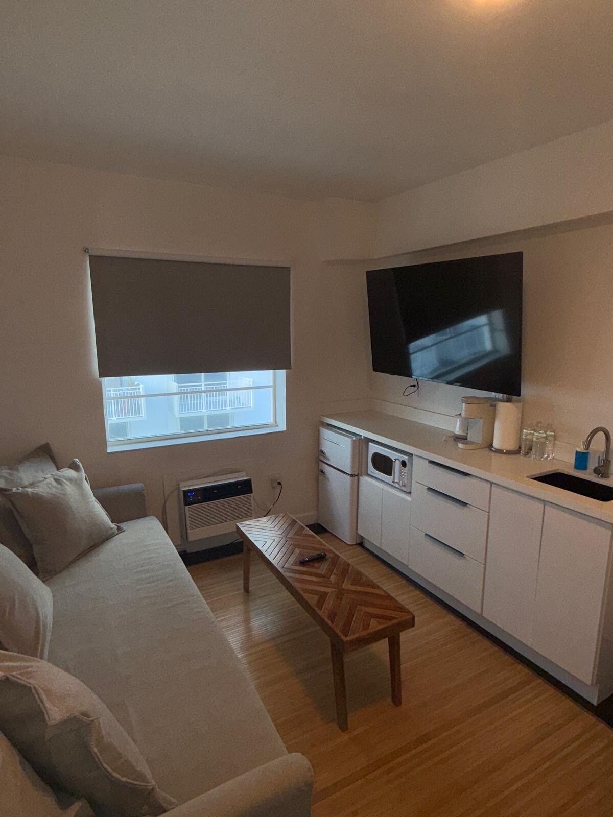 Experience refined luxury in this newly renovated South Beach suite, just one block from the Ocean. Perfect for leisure or business, it features a plush King bed (or two single beds upon request), high-speed Wi-Fi, Smart TV, and a dedicated workspace. Thoughtful touches include a wardrobe with hangers, iron, and ironing board. Secure gated parking is available nearby for $20 per day—offering style, comfort, and convenience in the heart of South Beach.