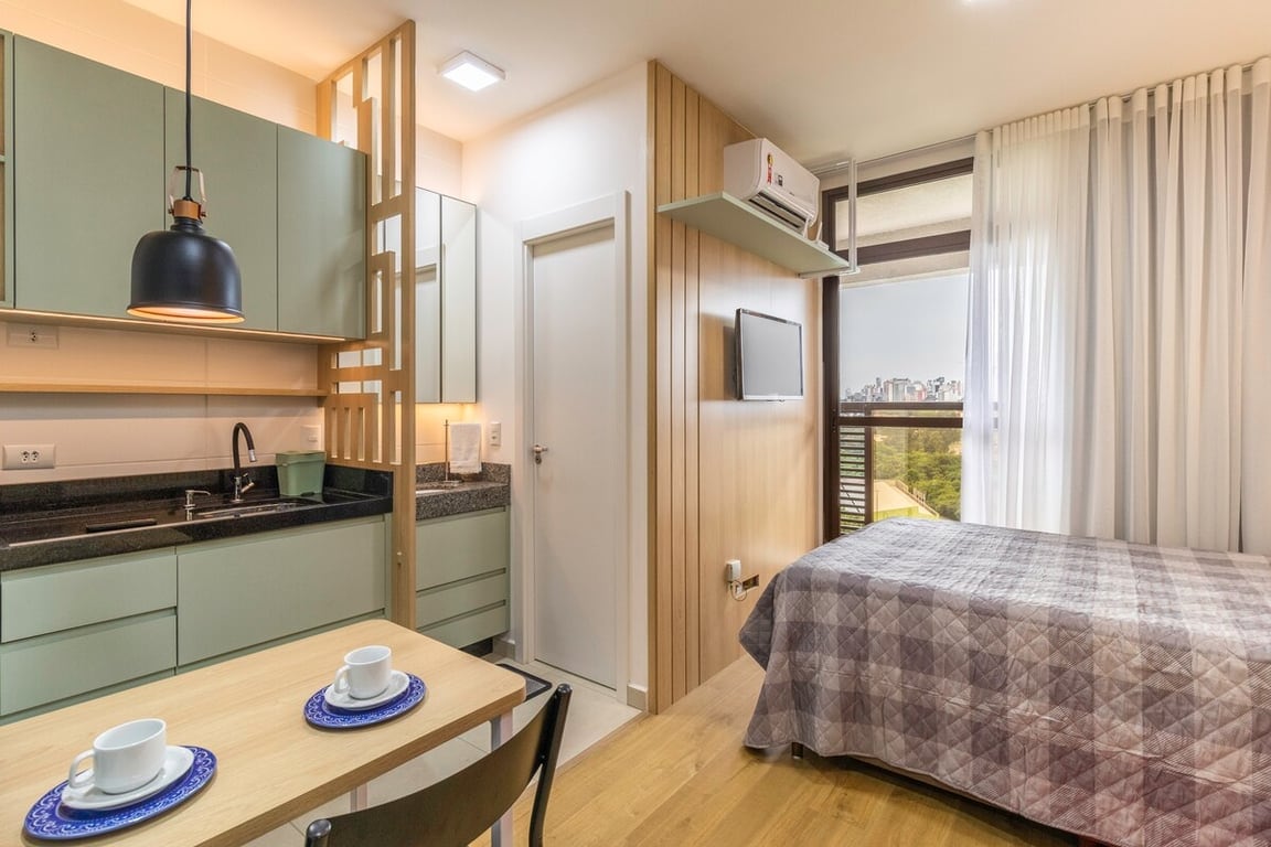 Beau studio avec vue, espace de travail et climatisation